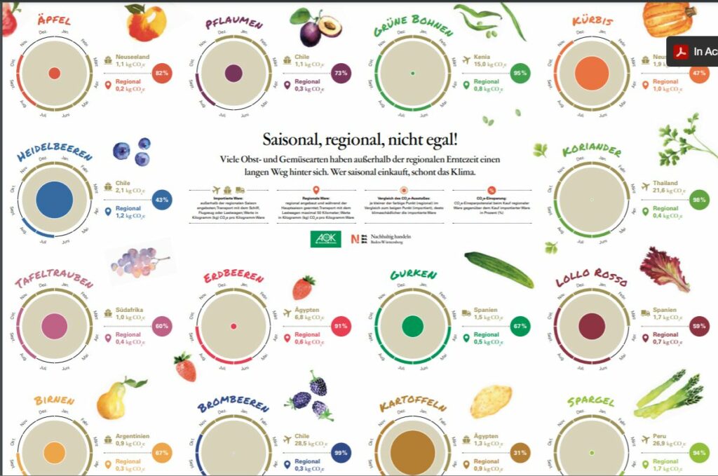 Besonders umweltbelastend sind Transporte mit dem Flugzeug. Aber auch ein Anbau im Gewächshaus treibt den Energieverbrauch zusätzlich in die Höhe. Wieviel CO2 bei der Produktion von verschiedenen Obst- und Gemüsesorten entsteht, hängt deshalb maßgeblich von der Jahreszeit und der Herkunft des Produkts ab. So werden beispielsweise für die Produktion eines Kilos Erdbeeren aus der Region in der Zeit von Juni bis September 0,6 kg CO2 emittiert. Wer allerdings in den Wintermonaten zu Erdbeeren aus Ägypten greift, verursacht mehr als zehnmal so hohe Emissionen. Wenn wir ausschließlich saisonales Obst und Gemüse aus der Region beziehen, können wir deshalb jedes Jahr bis zu 180 kg CO2 einsparen. Hier findet ihr ein Poster der Nachhaltigkeitsstrategie Baden-Württemberg, auf dem die Unterschiede für weitere Obst- und Gemüsesorten anschaulich dargestellt sind.
