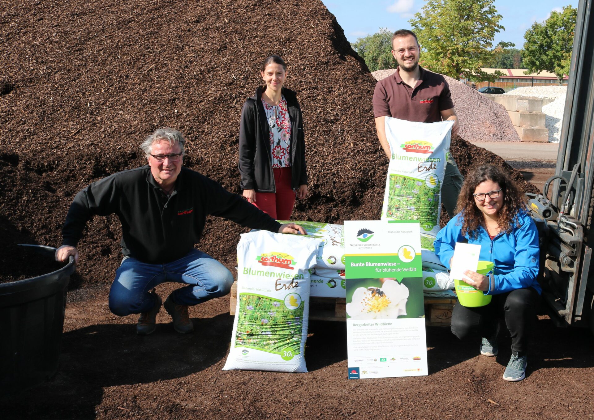 Torffreie Blumenerde für Gärten und den „Blühenden Naturpark“ präsentierten im Oktober 2020 (v. l.) corthum-Geschäftsführer Uwe Schönthaler, stv. Naturpark-Geschäftsführerin Yvonne Flesch, Nick Burkhardt, Mitglied der corthum-Geschäftsführung und Naturpark-Projektmanagerin Lilli Wahli. (Foto: Sabine Köllner)