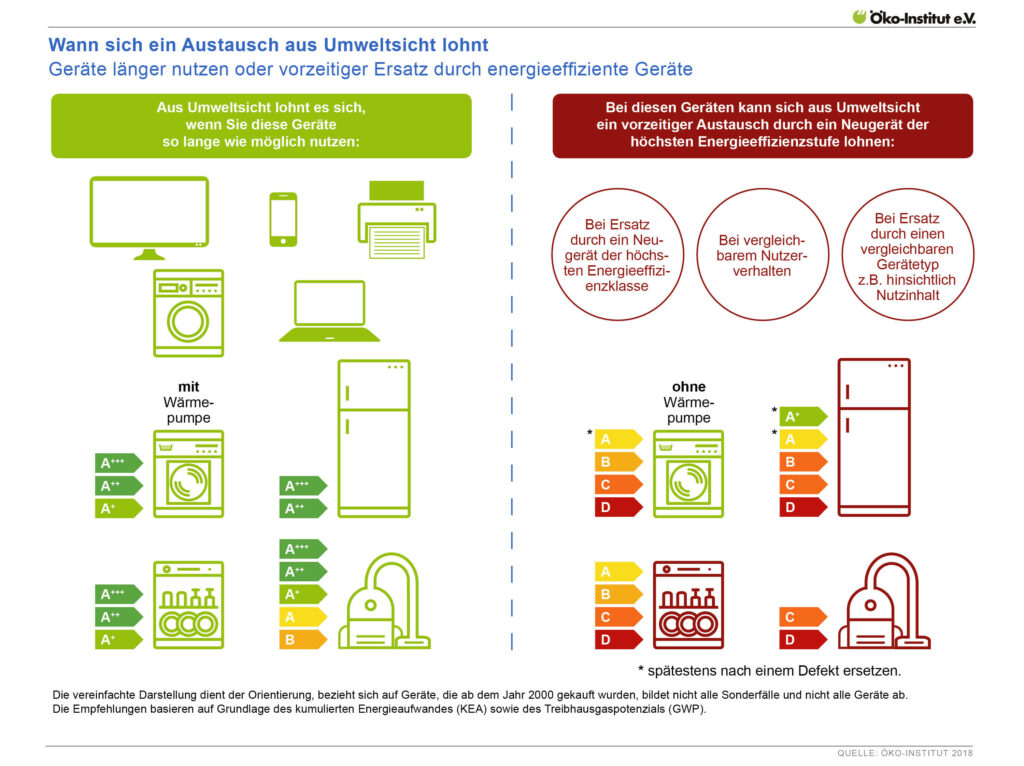 Ist es auch umweltfreundlicher, sich einen neuen Kühlschrank anzuschaffen, wenn man die Energie und Ressourcen einbezieht, die bei der Produktion verwendet anfallen? Das Öko-Institut Freiburg gibt darauf eine differenzierte Antwort. Der vorzeitige Austausch durch ein Neugerät der höchsten Energieeffizienzstufe lohnt sich unter Umweltgesichtspunkten für den Fall, dass sich das alte Gerät in der Energieeffizienzklasse A+ bis D befindet. Bei Geräten der Klassen A++ und A+++ ist es hingegen sinnvoll, das Gerät so lange wie möglich weiter zu nutzen. Hier gibt es eine hilfreiche Übersicht, die aufzeigt für welchen Fall es aus Umweltsicht sinnvoll ist, Haushaltsgeräte auszutauschen: