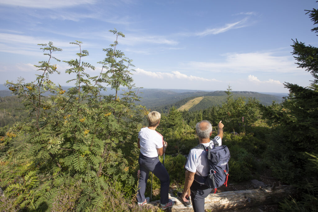 Mit fantastischem Panorama geht es weiter zum Hornisgrinde-Aussichtsturm, wo herrliche Weitblicke und die Grinde-Hütte zu einer Rast einladen. Ihr befindet euch nun auf dem mit 1.164 Metern höchsten Berg des Nordschwarzwaldes. Über einen schönen Pfad geht es dann weiter zum AugenBlick oberhalb des Mummelsees. Von dort habt ihr einen grandiosen Blick auf den See, das Hotel und über die Schwarzwaldhöhen.