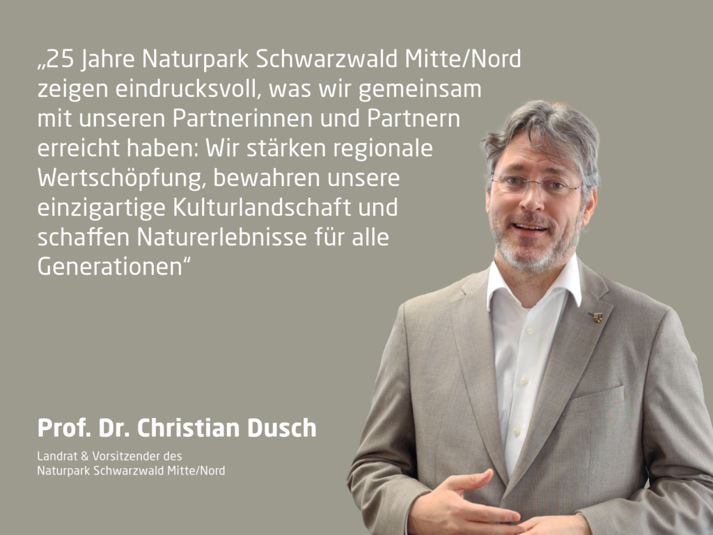 „25 Jahre Naturpark Schwarzwald Mitte/Nord zeigen eindrucksvoll, was wir gemeinsam mit unseren Partnerinnen und Partnern erreicht haben: Wir stärken regionale Wertschöpfung, bewahren unsere einzigartige Kulturlandschaft und schaffen Naturerlebnisse für alle Generationen“, sagt der Vorsitzende des Naturparks Schwarzwald Mitte/Nord und Landrat des Landkreises Rastatt, Prof. Dr. Christian Dusch. „Dieses Jubiläum feiern wir mit Stolz und mit einem Programm, das die ganze Vielfalt unseres Naturparks sichtbar macht. Mit dem Jubiläums-Naturpark-Markt in Loffenau starten wir mit dem ersten großen Highlight für Einheimische und Gäste ins Jubiläumsjahr.“