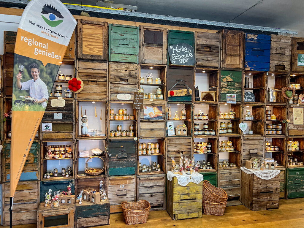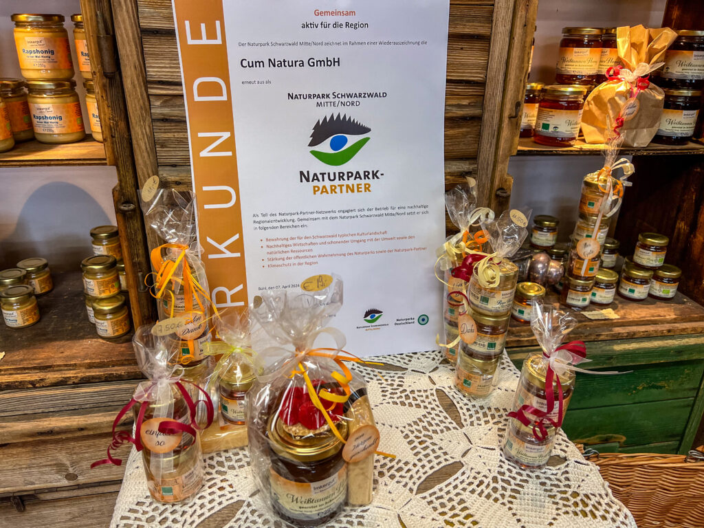 Cum Natura stellt auch exklusiv für den Naturpark den Naturpark-Honig her. Dafür sammeln die Bienen Nektar in allen Höhenstufen des 4.200 Quadratkilometer großen Naturpark-Gebiets. Der Naturpark-Honig ist im Info-Shop in Bühlertal oder im Online-Shop des Naturparks (www.naturparkschwarzwald.de) erhältlich.