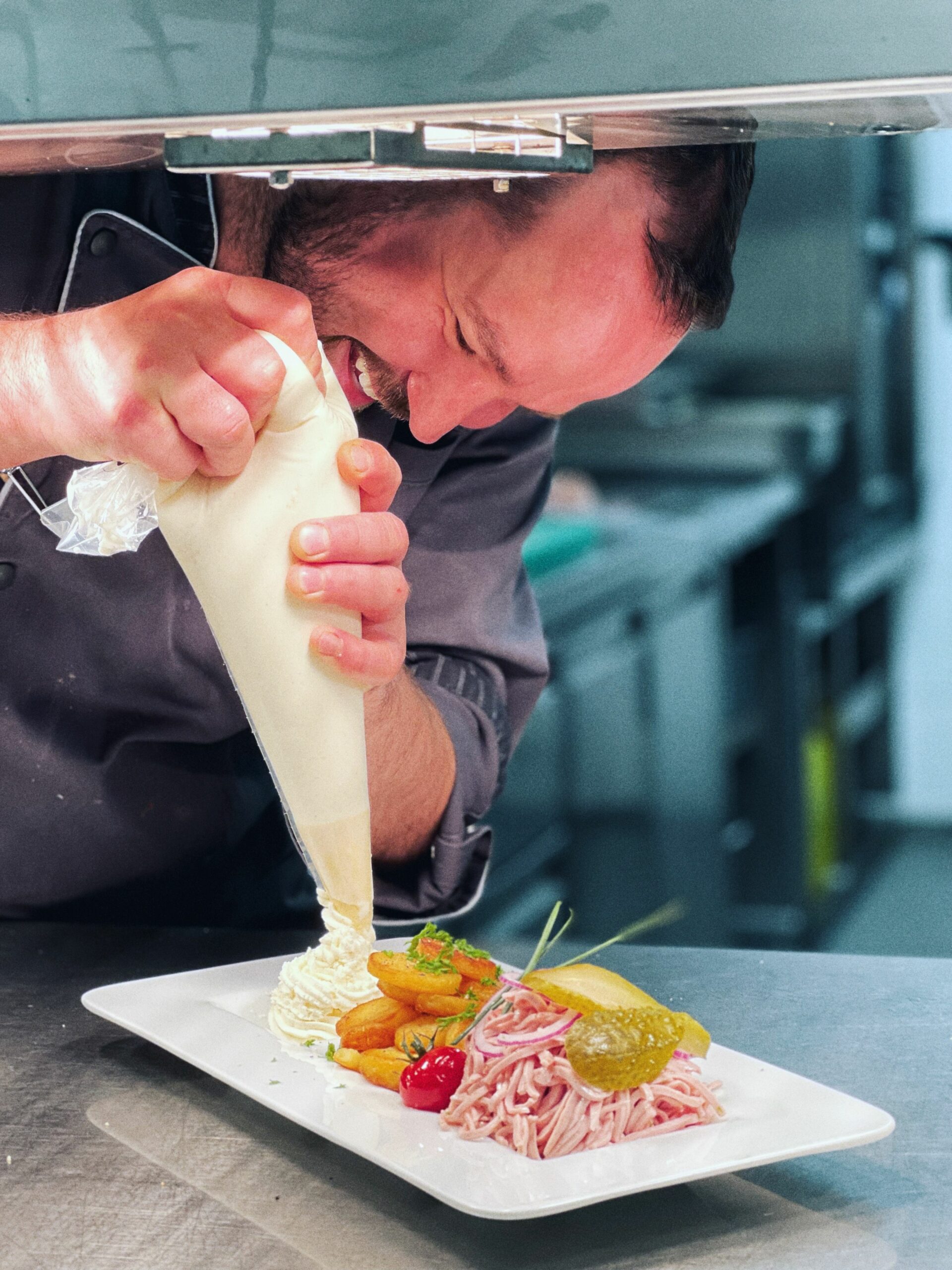 Bibiliskäs in einen Spritzbeutel mit großer Sterntülle füllen. Jetzt geht’s ans Anrichten: Wurstsalat und Bratkartoffeln schön nebeneinander auf einem Teller platzieren, den Bibiliskäs daneben anrichten, frische Petersilie darüber geben und … genießen!