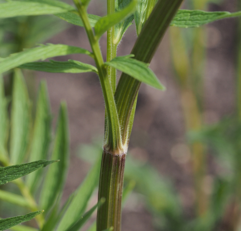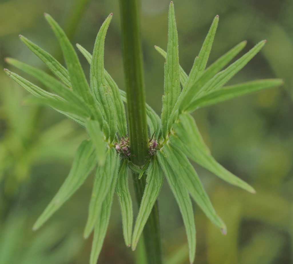 Echter Baldrian, Valeriana officinalis, auch als Arzneibaldrian, Katzenkraut, Mondwurzel, Wildfräuleinkraut, Stinkwurz und Hexenkraut bekannt, gehört zur Familie der Geißblattgewächse (Caprifoliaceae). Bei dieser berühmten Heilpflanze entwickelt sich im Frühjahr aus einem faserigen Wurzelstock zunächst eine grundständige Blattrosette mit unpaarig gefiederten lanzettlichen Blättern, aus deren Mitte sich ein markanter, kantig geriefter, hohler Stängel bis zu 1,5 Meter in die Höhe schiebt.
