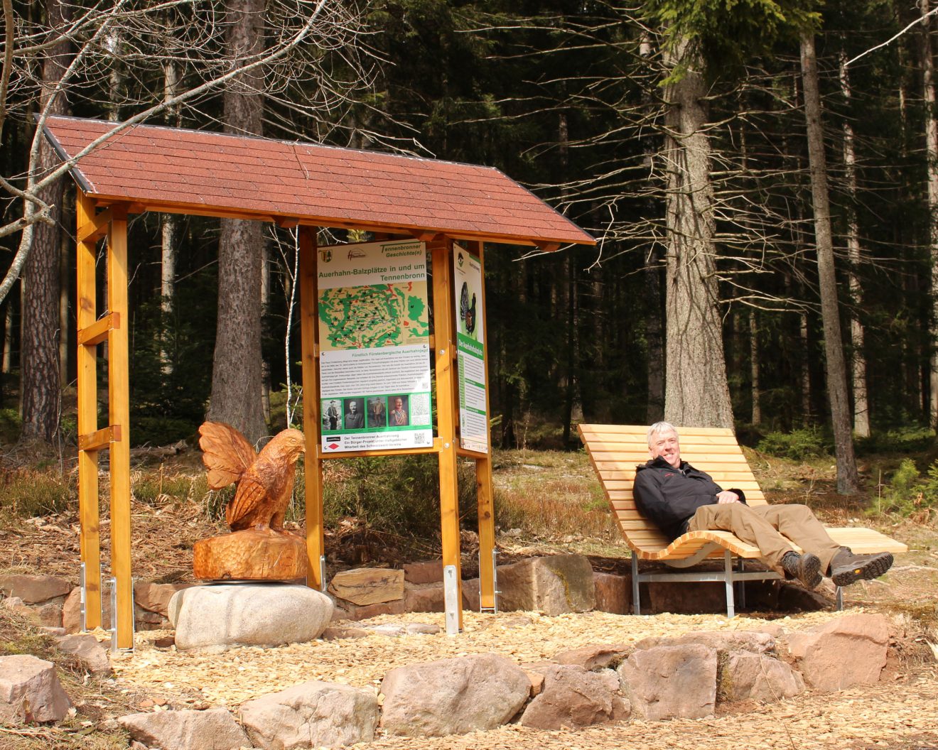 Die Wanderer folgen dem Höhenrücken und gelangen zum Auerhahn-Nistplatz beim Waldsportplatz. Große eierförmige helle Steine dienen nicht nur als Sitzgelegenheit, sondern sollen natürlich ans Auerhahn-Gelege erinnern. Die nächste Infotafel ist nach rund einem Kilometer bergab über einen schmalen Waldpfad zu erreichen. Am „Auerhahn-Schlafplatz“ befinden sich ein Fernrohr und wieder eine Himmelsliege zum Ausruhen. Man lernt, dass die großen Vögel sich zwar meist am Boden aufhalten, sich aber zum Schlafen aus Sicherheitsgründen auf hohen Ästen in den Bäumen niederlassen.