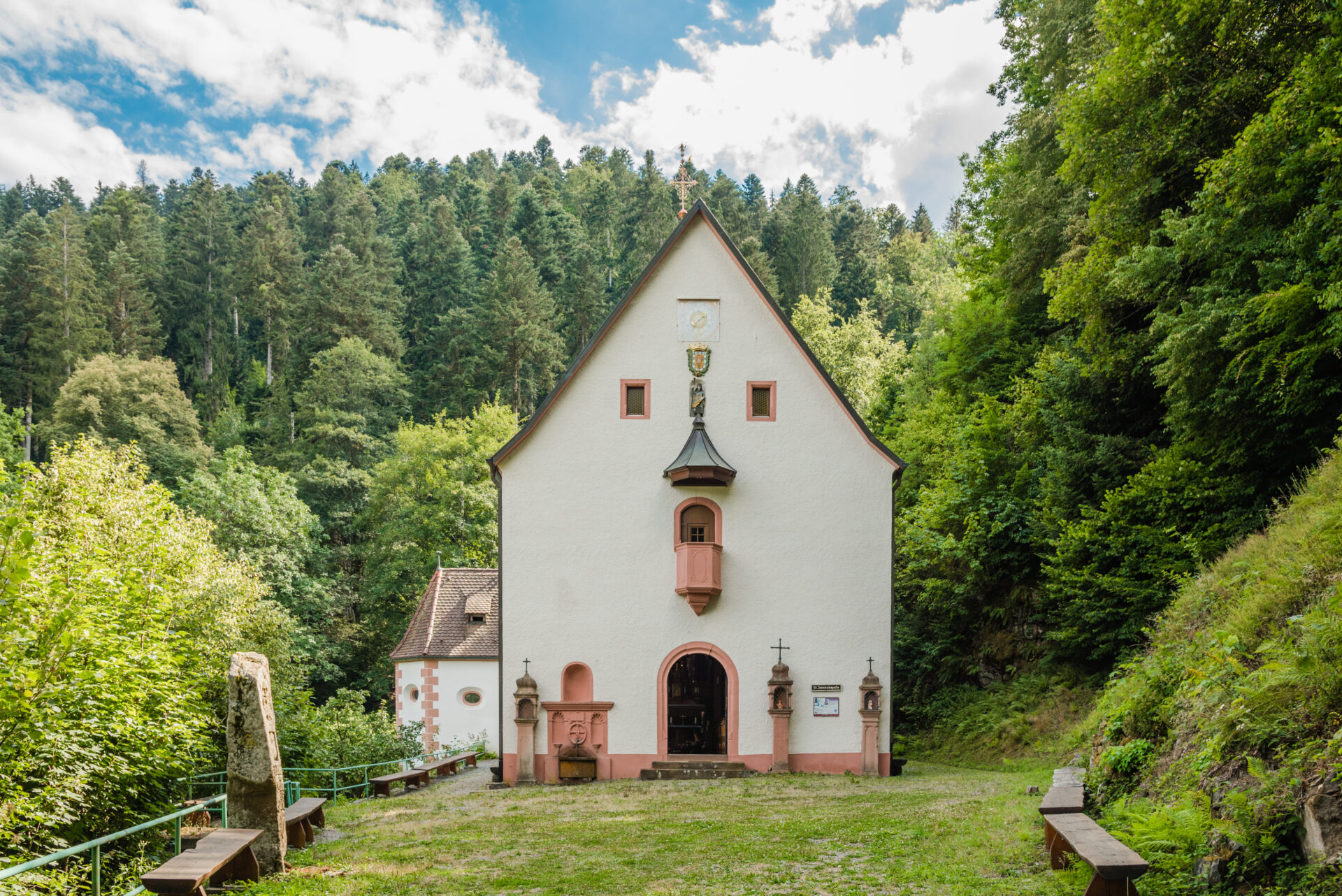 Von hier geht es über einen wunderbaren, teilweise in die Felsen gehauenen Fußpfad weiter zur St.-Jakobus-Kapelle, einem uralten Wallfahrtskirchlein in stiller Waldeinsamkeit. Auch hier spendet ein Brunnen kühles Quellwasser. Das barocke Gebäude mit Messnerhaus aus dem Baujahr 1680 wird heute als Klause genutzt. Beeindruckend die reiche Innenausstattung, unter anderem mit Altären aus der Villinger Werkstatt Schupp und Gemälden des Wolfacher Kunstmalers Konrad Schmider.