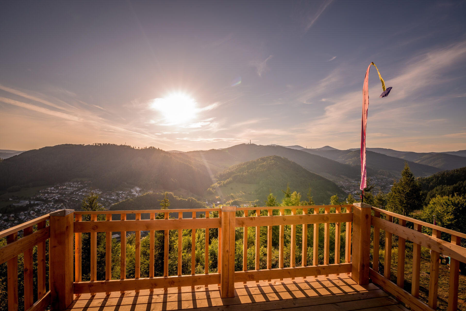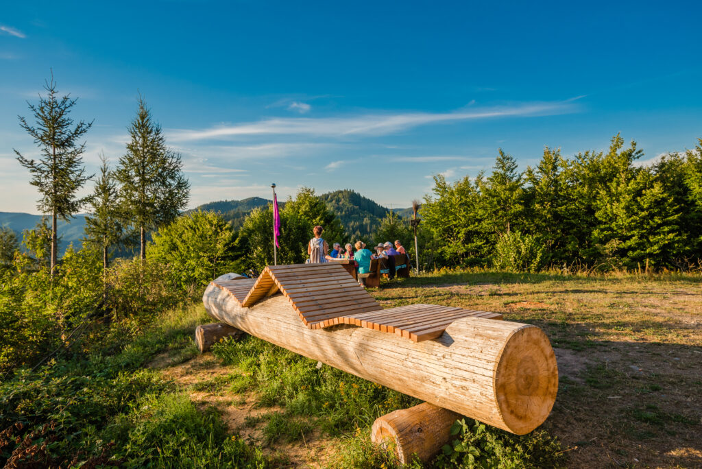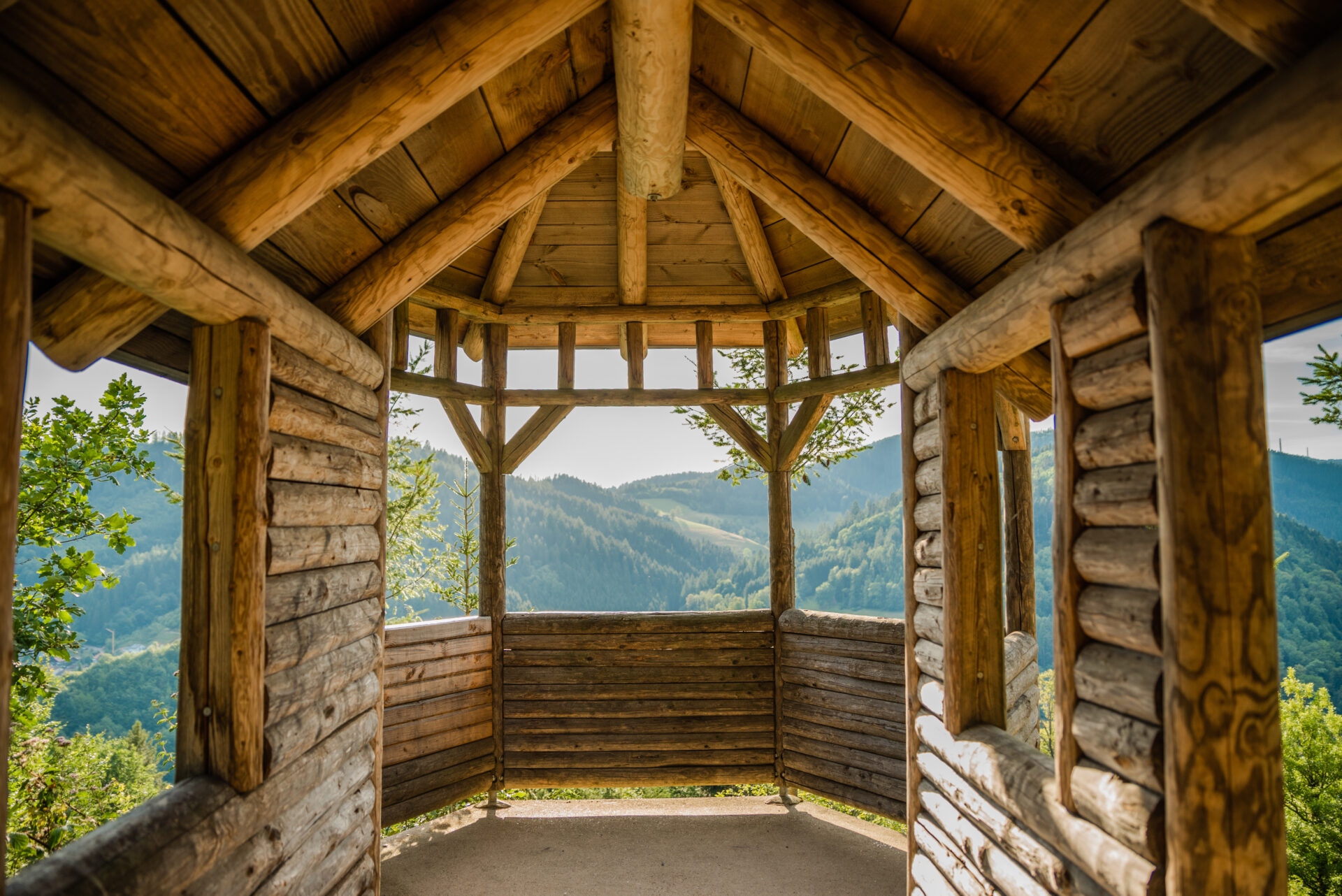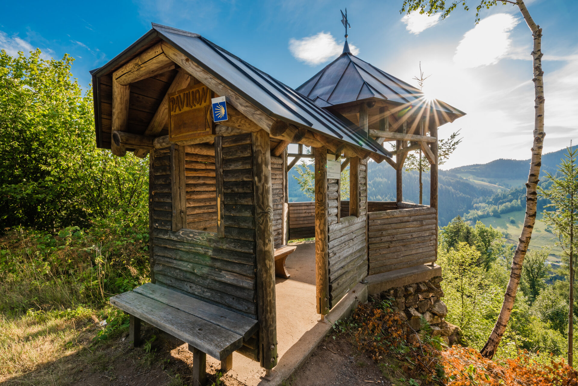 Eurer Weg führt nun am Lüftungsturm des Reutherbergtunnels vorbei zum Pavillon. Diese offene Schutzhütte bietet euch einen schönen Blick ins Kinzig- und Wolftal. Zum ersten Mal wurde der Pavillon im Jahr 1881 erbaut, danach mehrmals erneuert. Der Orkan „Lothar“ fegte ihn dann wieder von seinem Sockel. Die Freiwillige Feuerwehr Wolfach hat ihn im Jahr 2002 wieder aufgebaut.