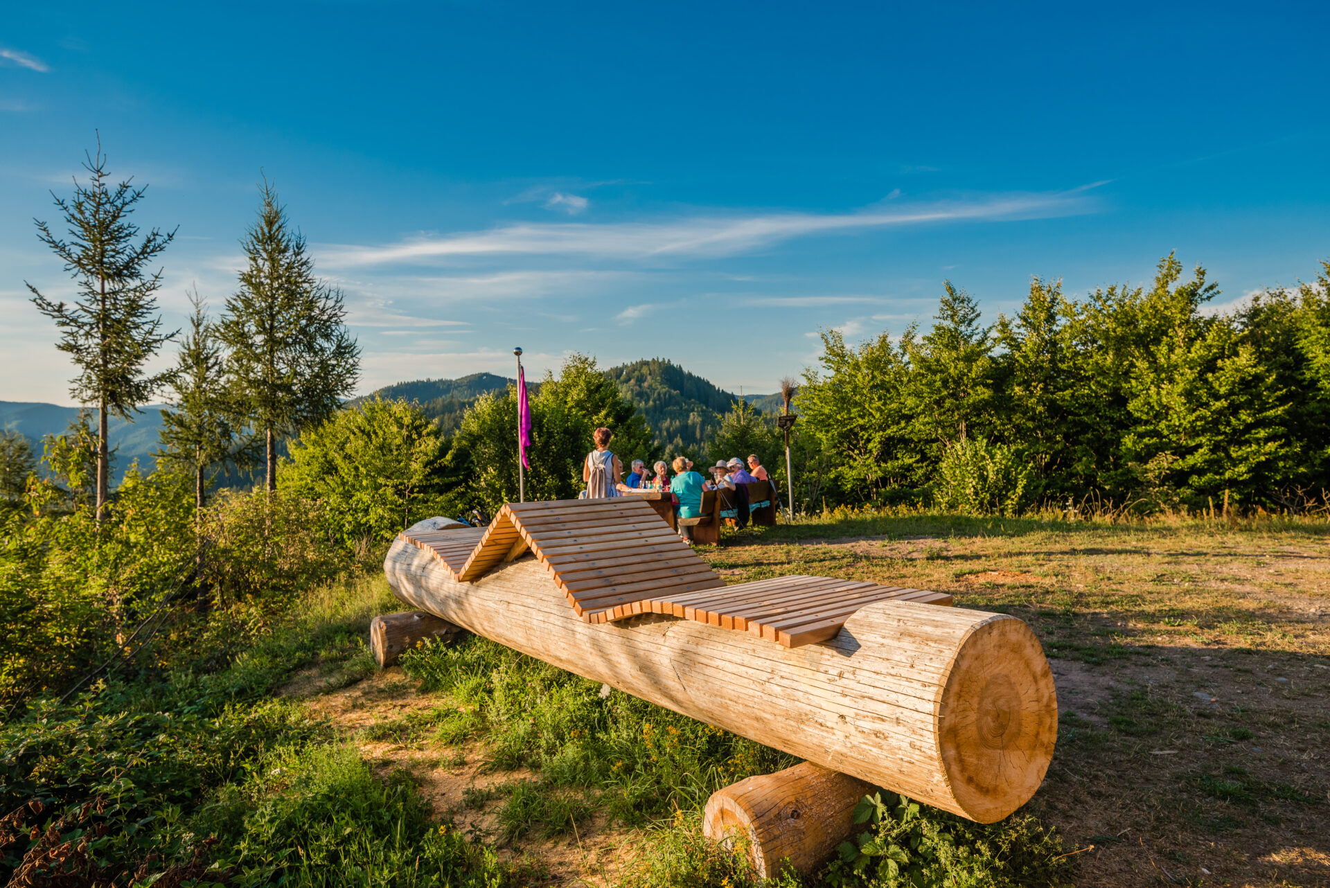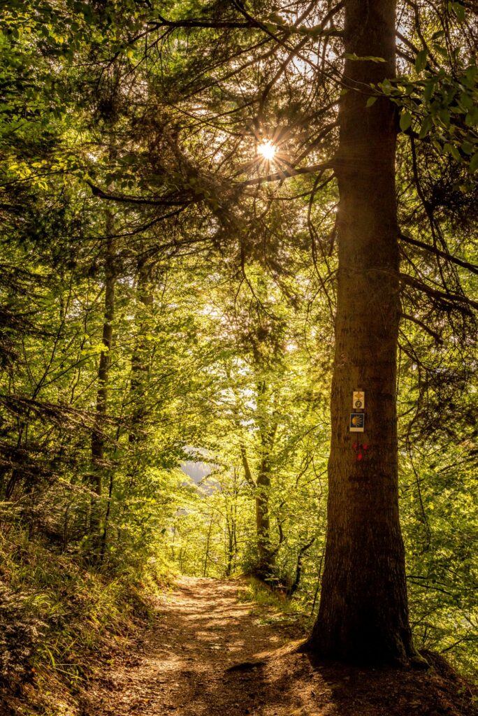 Vorbei am Gesundheitsbrünnele mit seinem klaren kühlen Bergwasser erreicht ihr nach einem bequemen Wegstück den anspruchsvollsten Anstieg der Tour. Ein Fußpfad führt steil hinauf zum Oberen Siechenwaldweg. Über den Firmlingsweg erreicht ihr schließlich den höchsten Punkt der Wanderung, den „Berghexenlandeplatz“ mit seiner Aussichtsplattform. Hier befinden sich auch sich bequeme Sonnenliegen. Den Namen hat der Platz von einer Damenriege des Turnvereins, die immer hierher kamen, um für ihre Alpenwanderungen zu trainieren. Deshalb wurden sie „die Berghexen“ genannt.