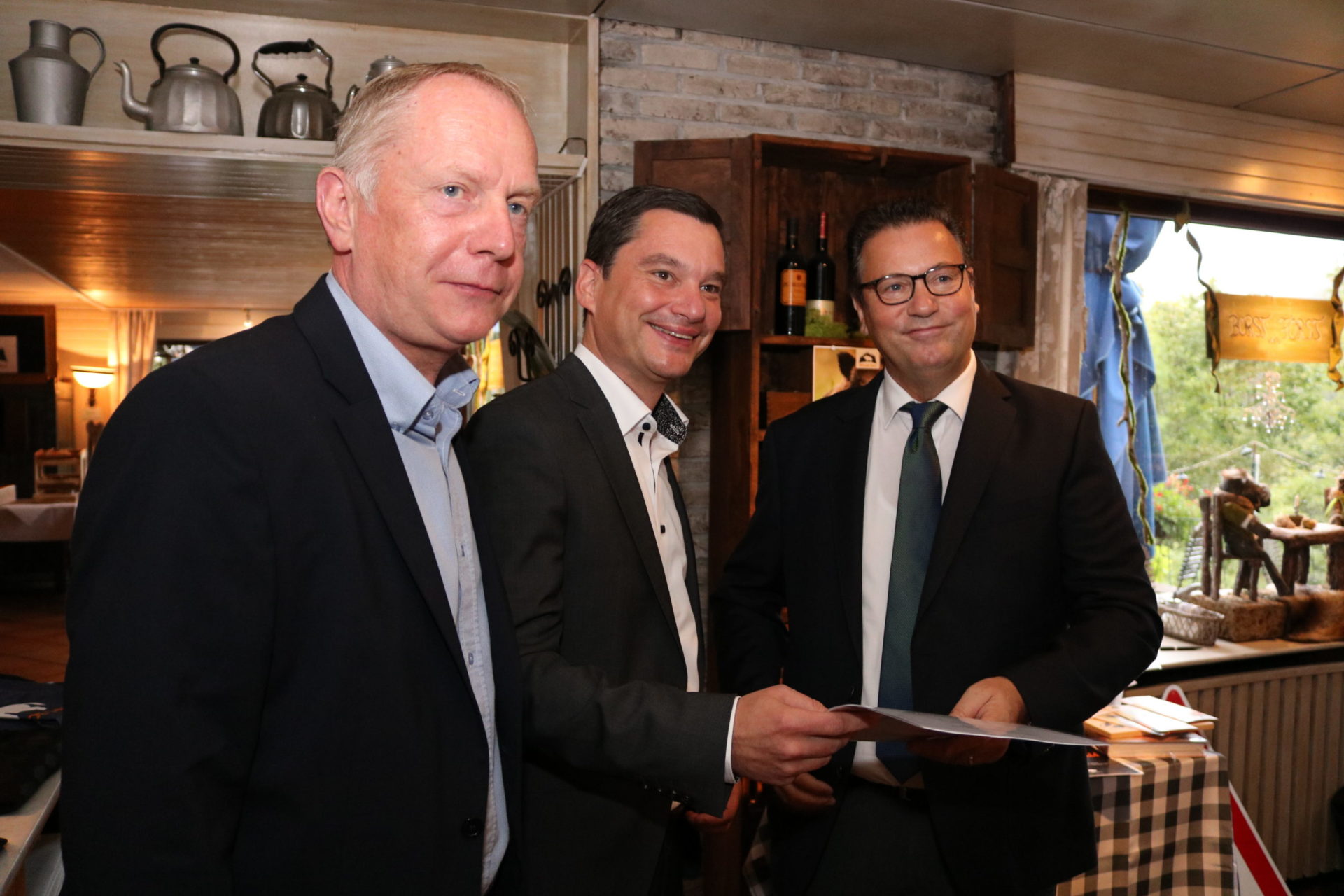 Minister Peter Hauk MdL (r.) überreicht den Zuwendungsbescheid für das Projekt „Wilde Sau“ an den Naturpark-Vorsitzenden Klaus Mack (M.) und Geschäftsführer Karl-Heinz Dunker.