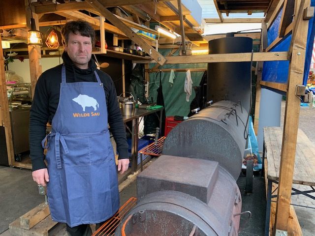 Jäger und Marktbeschicker Björn Kraft am Smoker. Seine Spezialität: Pulled Porc von der Wilden Sau. Er wird künftig auf den Naturpark-Märkten mit seinem exklusiven Wilde-Sau-Trailer vor Ort sein. -