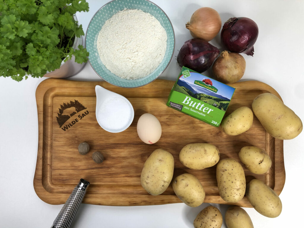 Die Konsistenz des Teiges hängt vor allem von einer Zutat ab: der Kartoffel. Diese bringt je nach Sorte unterschiedliche Eigenschaften mit, drum kann man die genau Menge an Mehl nur schätzen. Je älter die Kartoffel, desto weniger Feuchtigkeit enthält sie und umso weniger Mehl muss hinzugegeben werden.