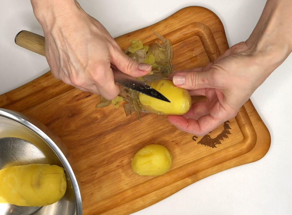 1. Kartoffeln mit der Schale in Salzwasser garen. Abschrecken, pellen und sofort zerstampfen (oder durch eine Kartoffelpresse drücken), abkühlen lassen.