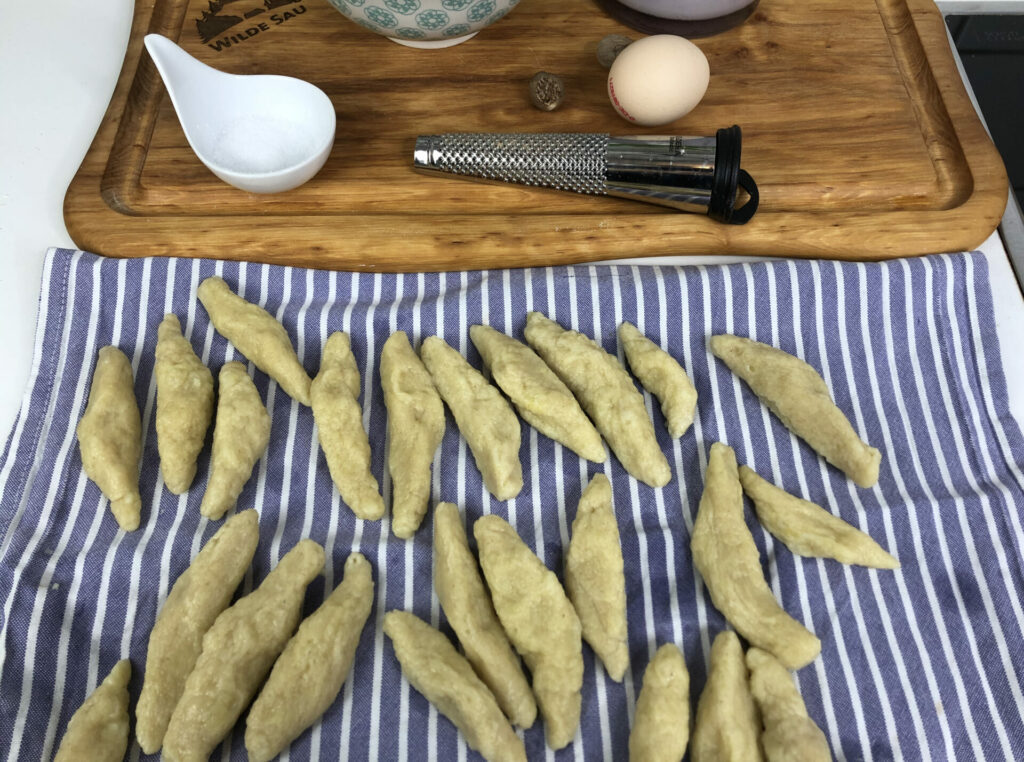 2. Den Teig auf einer bemehlten Arbeitsfläche zu 2 bis 2,5 cm dicken Rollen formen. Jeweils 1,5 bis 2 cm breite Stücke abschneiden und mit der Hand zu an den Enden spitz zulaufenden Bubespitzle formen.