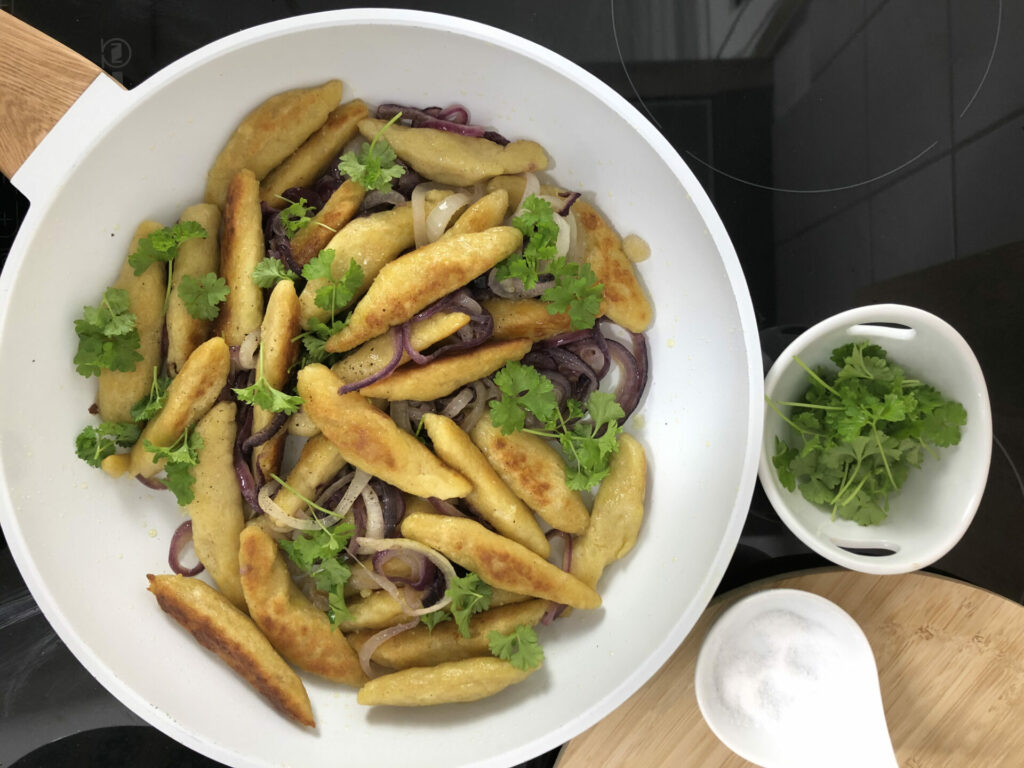 5. In Butter die Bubespitzle/Schupfnudeln goldbraun braten.