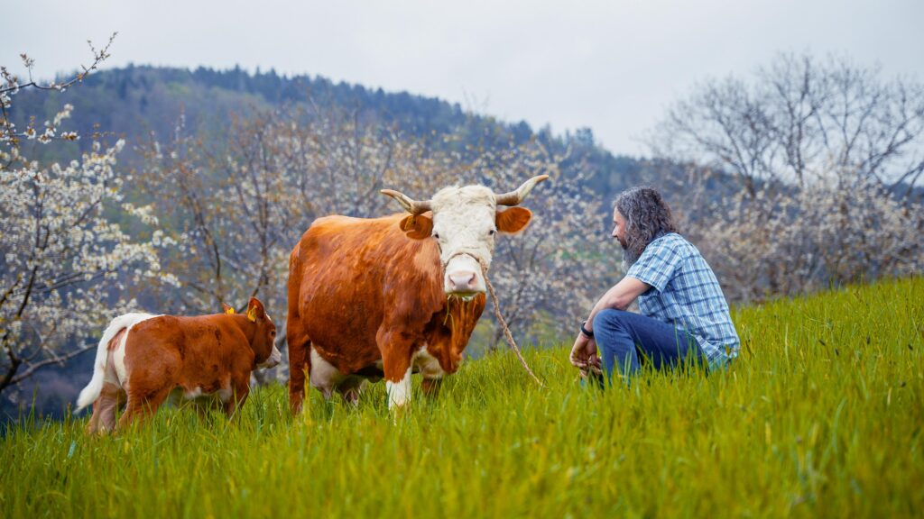 Stefan Doll lehnt seine Leiter an einen Obstbaum auf seiner Streuobstwiese und klettert hinauf. „Es ist einfach Glück, wenn man in der Natur und mit der Natur leben darf“, sagt er und schneidet den Baum zurück. Stefan Doll ist Naturpark-Partner und betreibt auf seinem Bergbauernhof in Sasbachwalden (Ortenaukreis) eine Straußwirt. Dort können die Leute das essen und trinken, was auf dem Hof frisch hergestellt wird. „Ich sehe die Kirschen und nebendran kann ich den Schnaps direkt trinken, den der Betrieb produziert hat. Das ist legendär, das ist wunderbar“, beschreibt Doll. „Wir arbeiten mit der Natur und feiern zusammen.“