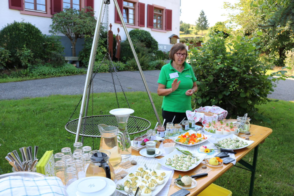 Auf der kurzen Wanderung hinter ihrem Hof stellte Ulrike Armbruster die Welt der Kräuter im Herbst und ihre positive Wirkung auf den Menschen vor. Sie stellte beispielsweise Brennnessel, Schafgarbe, Spitzwegerich, Breitwegerich und am Ende im Kräutergarten die Hagebutte vor. Die Brennnessel wächst gerne an stickstoffreichen Stellen, ihre Samen sind essbar und nahrhaft und enthalten viel Vitamin C und Kieselsäure. Die Schafgarbe passt gut in den Salat, ihre Bitterstoffe sind gut für die Verdauung. Der Spitzwegerich wiederum ist gut für die Wundheilung. In der Küche passt er gut zu Pilzgerichten. Der Breitwegerich dient als natürliches Blasenpflaster. Die Hagebutte ist zwar kein Wildkraut, findet aber jetzt im Herbst reichlich Verwendung in der Küche, zum Beispiel als Quitten-Hagebuttentee oder Hagebuttenmus als Brotaufstrich oder zur Dessertveredelung. Tipp von Ulrike Armbruster: Bei Wildkräutern immer die Blätter waschen, Blüten und Samen aber nicht!