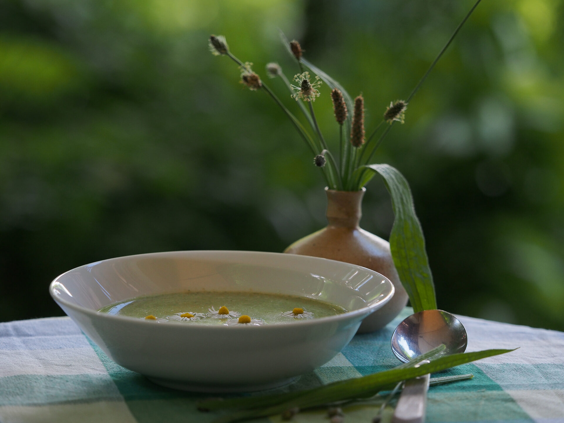 Tipp Wenn ihr die Suppe unpüriert lasst, bleiben die Spitzwegerichstreifen sichtbar und wer keine Sahne will, lässt sie weg, das schmeckt puristischer und etwas bitterer.