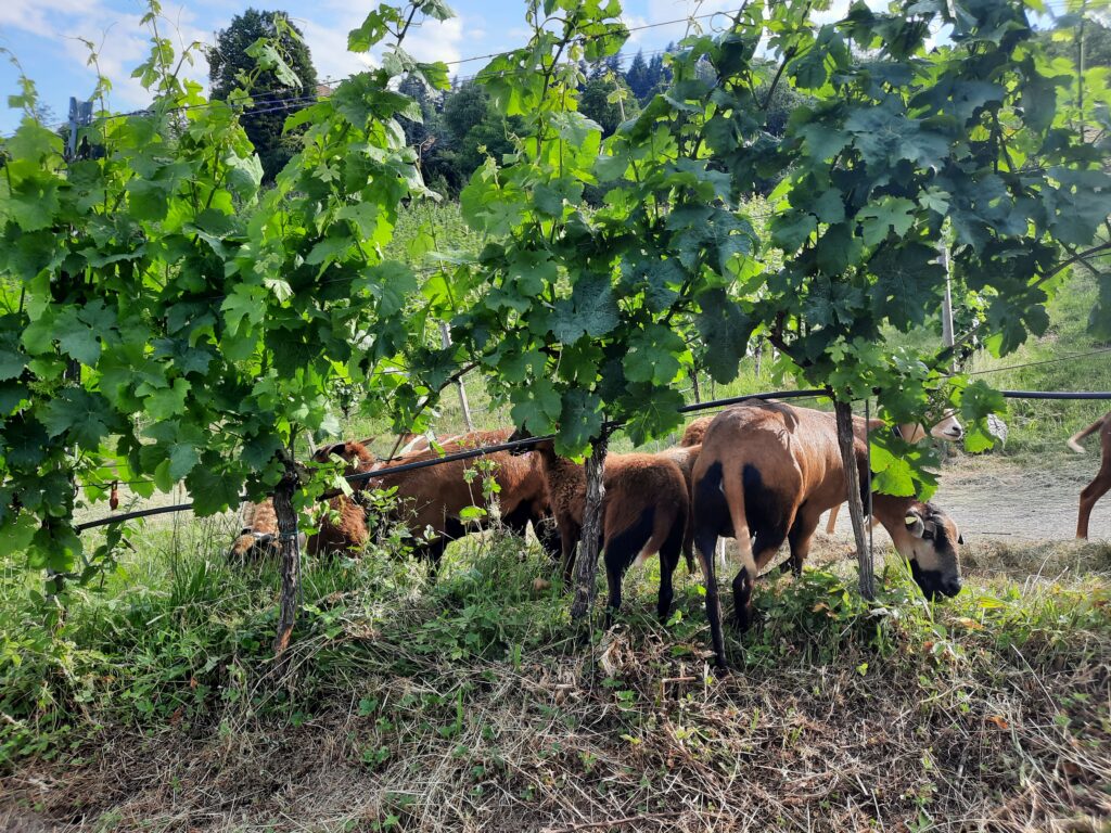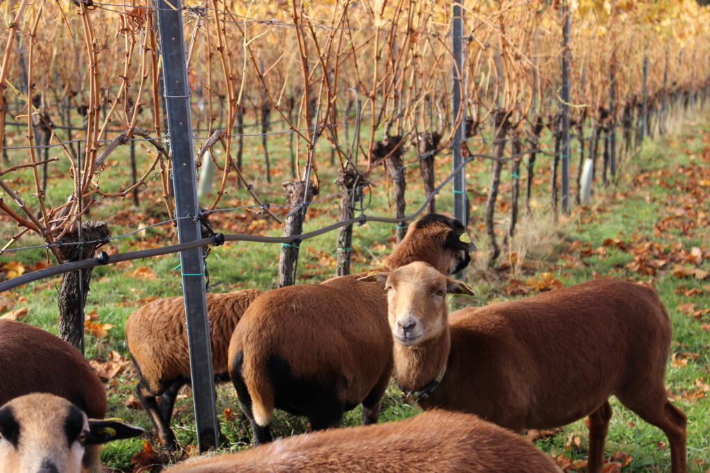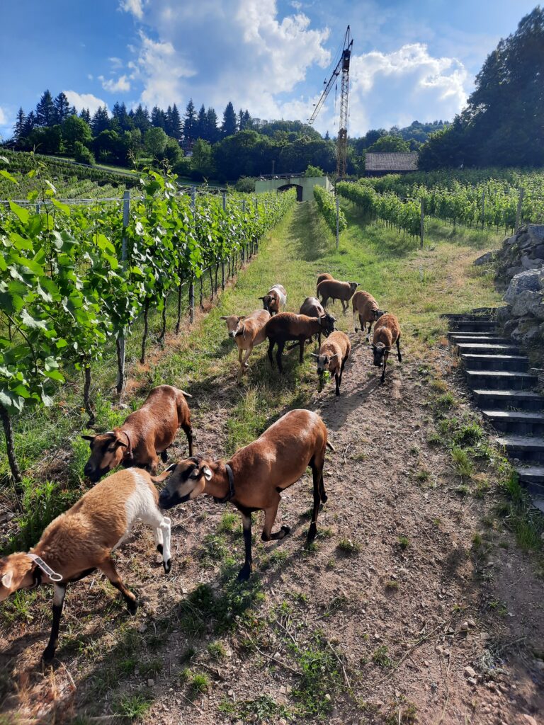 Statt Maschinen setzt Wild bei der Pflege seiner Reben auf tierische Unterstützung: Eine Herde von derzeit 13 Schafen samt Nachwuchs beweiden die Flächen zwischen den Rebstöcken. So reduziert Wild den Einsatz von Maschinen, schont den Boden, fördert ein lebendiges Ökosystem und baut Humus im Boden auf. Zur weiteren Bodenverbesserung setzt er Effektive Mikroorganismen ein. Diese unterstützen die Bodenfruchtbarkeit auf natürliche Weise und tragen zu gesunden, vitalen Reben bei. Auch beim Obstbau – etwa für die hauseigenen Schnäpse und Liköre – ist Wild eine naturnahe Bewirtschaftung wichtig.