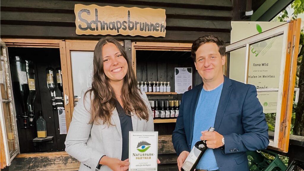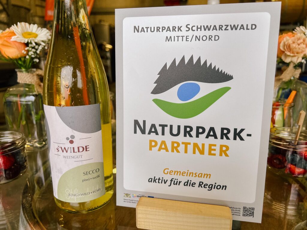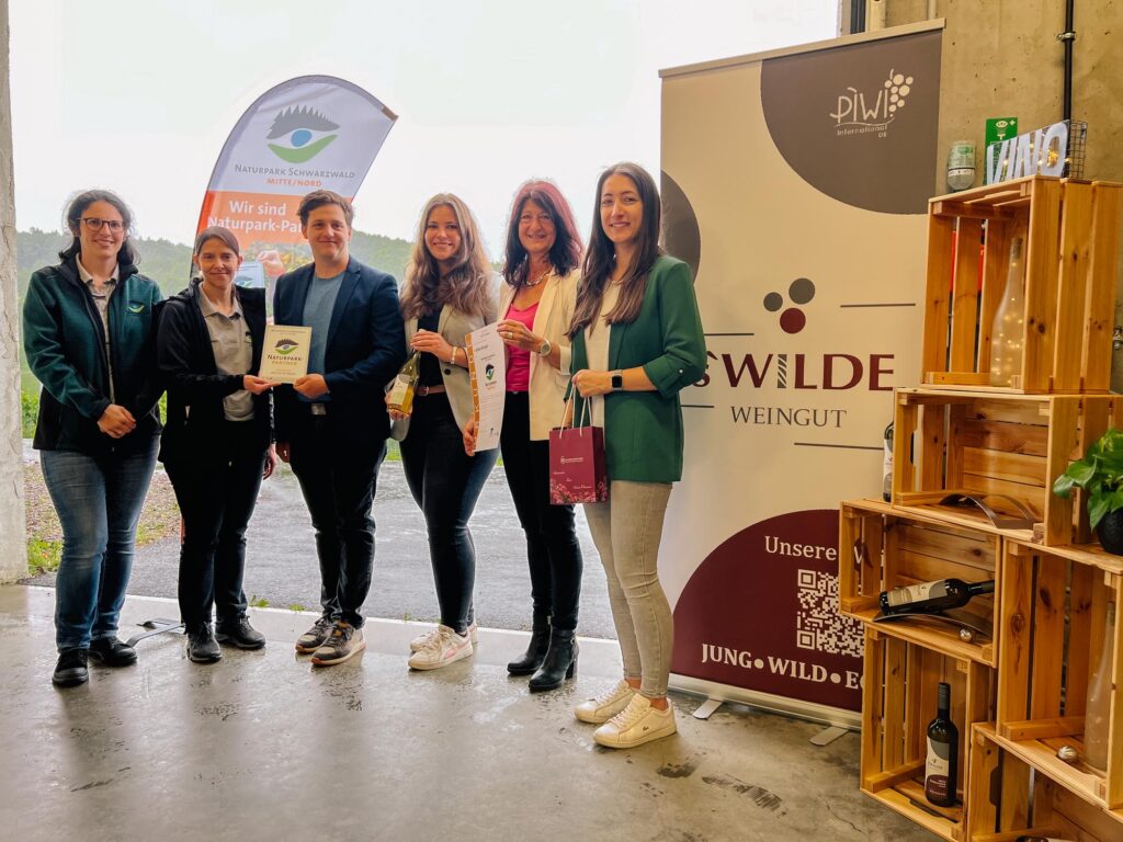 Der Naturpark Schwarzwald Mitte/Nord hat s’Wilde Weingut in Sasbachwalden (Ortenaukreis) am Freitag (6. Juni) als „Naturpark-Partner“ ausgezeichnet. Das Prädikat Naturpark-Partner steht für gelebte Regionalität und eine nachhaltige Wirtschaftsweise. „Stefan Wild setzt sich mit viel Leidenschaft dafür ein, die für den Schwarzwald typische Vorbergzone mit seinen Rebhängen und Streuobstwiesen in Sasbachwalden zu erhalten“, begründet die Stellvertretende Geschäftsführerin des Naturparks Schwarzwald Mitte/Nord, Yvonne Flesch, die Auszeichnung bei der Übergabe der Partner-Plakette an Stefan Wild. „Das ist gerade jetzt – wo viele unserer Weinbauern die arbeitsintensive Bewirtschaftung in den Steillagen aufgeben – ein besonders großes Verdienst!“
