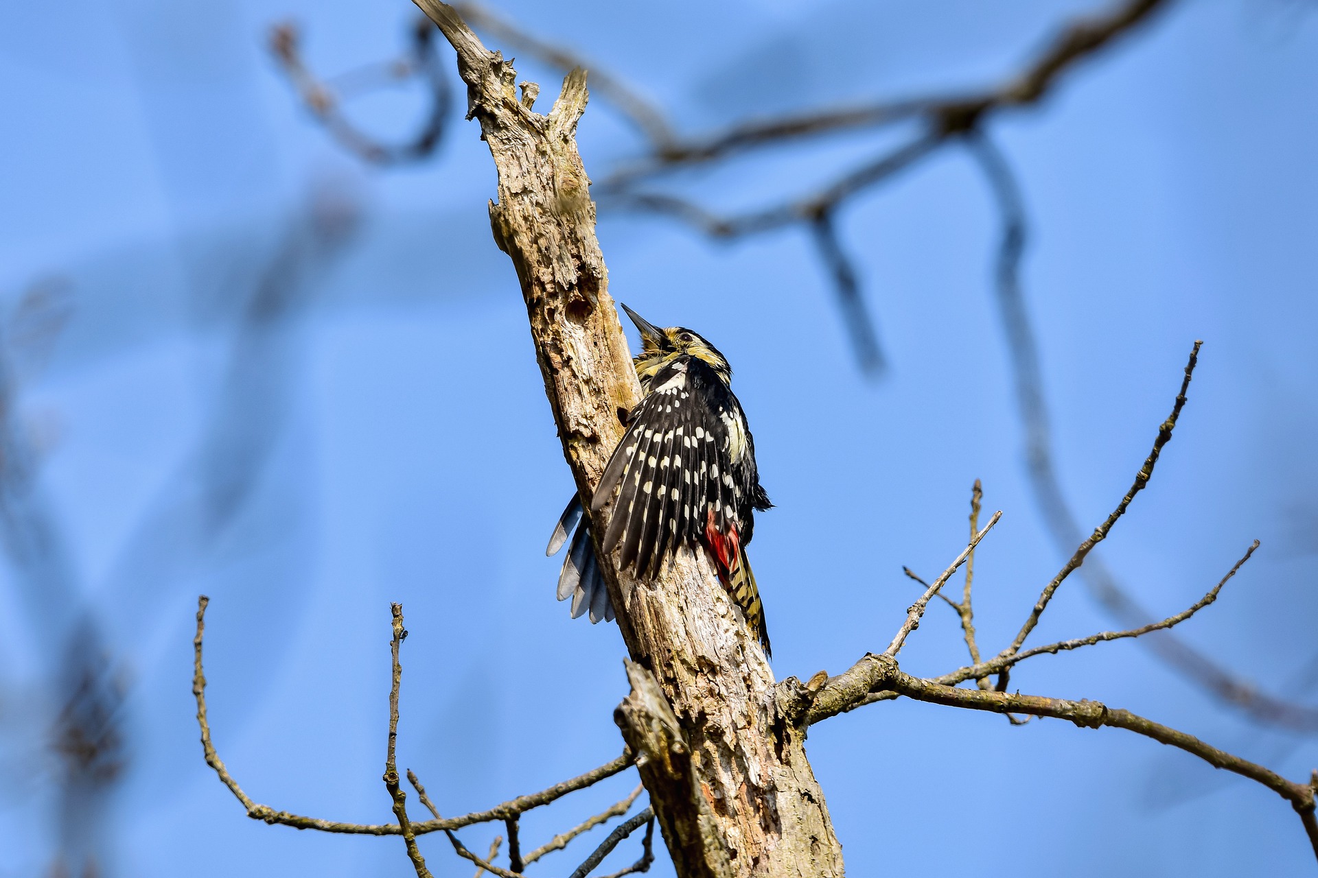 Natürlich zur Nahrungssuche. Er weiß, wo er die besten Käferlarven findet. Nicht umsonst ist er Naturpark-Detektiv geworden. Er klopft den Stamm mal hier, mal da ab und mit ein paar gezielten Schnabelhieben holt er die Larven unter der Rinde hervor. Doch selbstverständlich setzt er seinen Hammerschnabel auch ein, um eine Wohnhöhle für den Nachwuchs zu zimmern. Dazu bevorzugt er alte, teils morsche Bäume. Hat er sich erst einmal von außen durch da gesunde Holz gearbeitet, fällt es ihm leichter, im darunter liegenden faulen Material die Höhle schnell zu vergrößern.