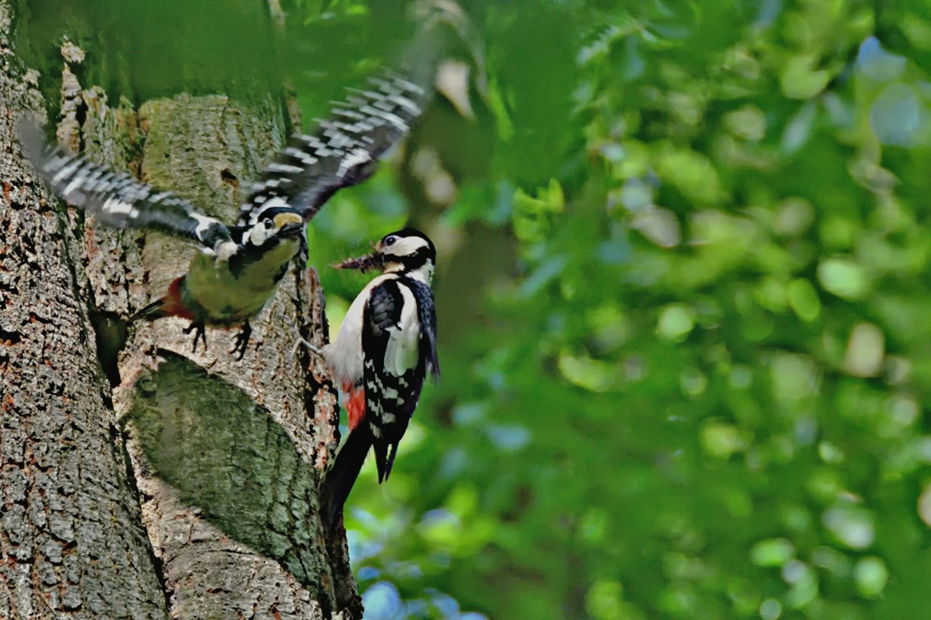 Beim Nestbau wechseln sich Männchen und Weibchen ab. Nestbau ist nicht ganz korrekt, denn der Buntspecht baut kein richtiges Nest wie andere Vögel. Er lässt einfach Holzspäne am Grund seiner Höhle liegen – ein weicher und gleichzeitig saugfähiger Untergrund für die Jungvögel. Kurioserweise baut der Buntspecht mehr Höhlen als er selbst braucht. So finden auch andere Tiere wie Käuze, Meisen, Fledermäuse oder Siebenschläfer eine Behausung. Und das nicht nur in den überzähligen, sondern auch in den vom Specht verlassenen Höhlen.
