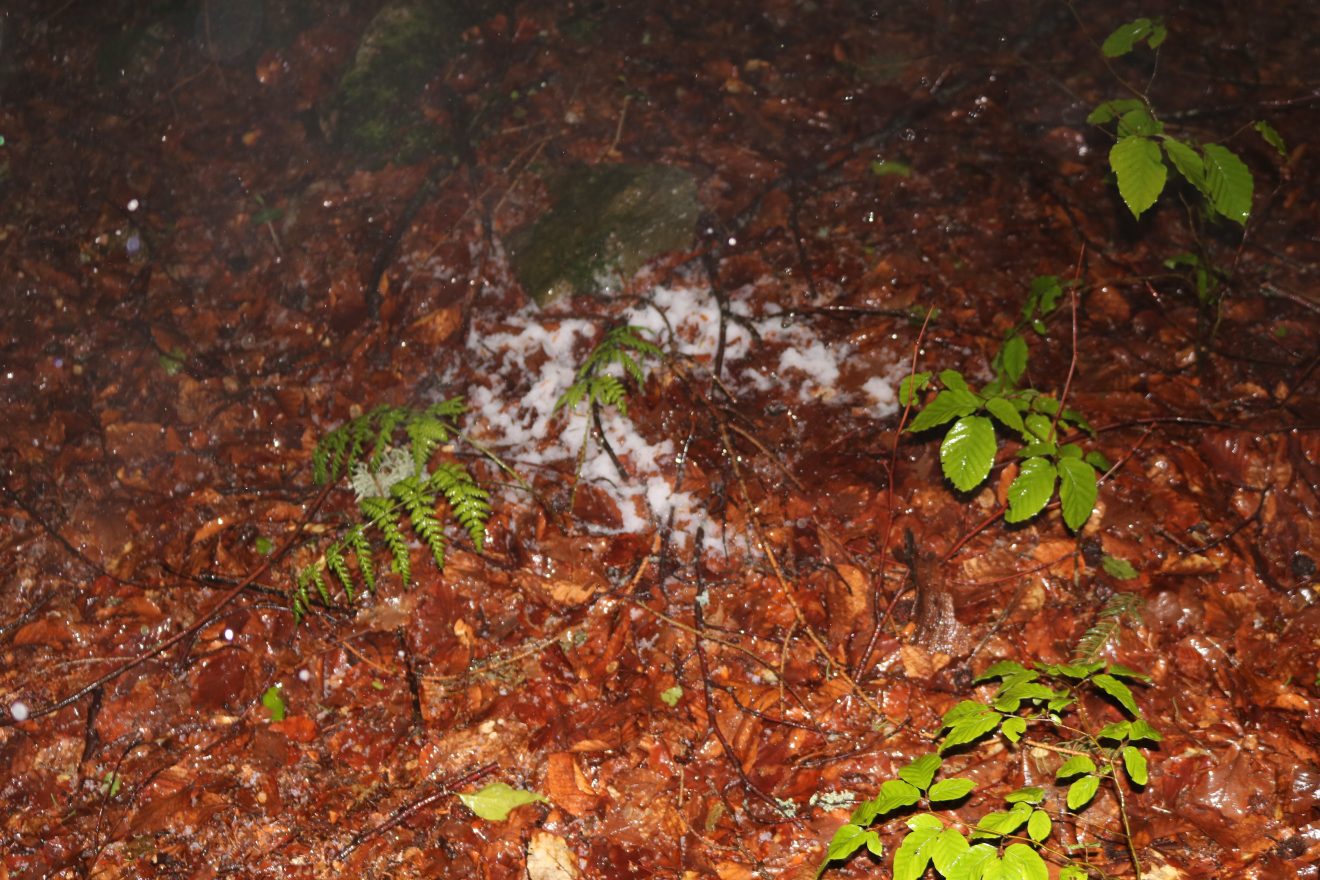 Heute ist die Gruppe vom Steinbruch zum Camp Grimbach gewandert und hat vieles darüber gelernt, wie man sich im Gelände bewegt. Bis einige Zeit vor dem Eintreffen auf dem Camp Grimbach hat das Wetter gehalten. Aber nun lässt der heftige Prasselregen nicht mehr nach. Kleine Wasserfälle stürzen vom Zeltdach, am Boden entstehen weiße Graupelhäufchen. „Da bekommt der Begriff ‚Waldbaden‘ eine ganz andere Bedeutung“, sagt Pia zur Erheiterung aller. Sie hat schon im letzten Jahr bei der ersten Verlosung das Trekking-Wochenende gewonnen und war so begeistert, dass sie die Ausbildung zum Trekking-Guide bei Christoph gemacht hat und heute für Trekk-n-Guide arbeitet.
