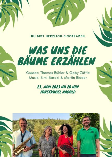 Forstkugel Nagold Meisterweg 49, NagoldDie Bedeutung von Bäumen steht in enger Verbindung mit der Landschaft, den Menschen und ihrer Geschichte und Kultur. Denn unser Leben ist ohne Bäume nicht möglich. Eine musikalische Reise durch die Vielseitigkeit der Natur zelebriert die Sängerin Simi Barazi, die sich durch