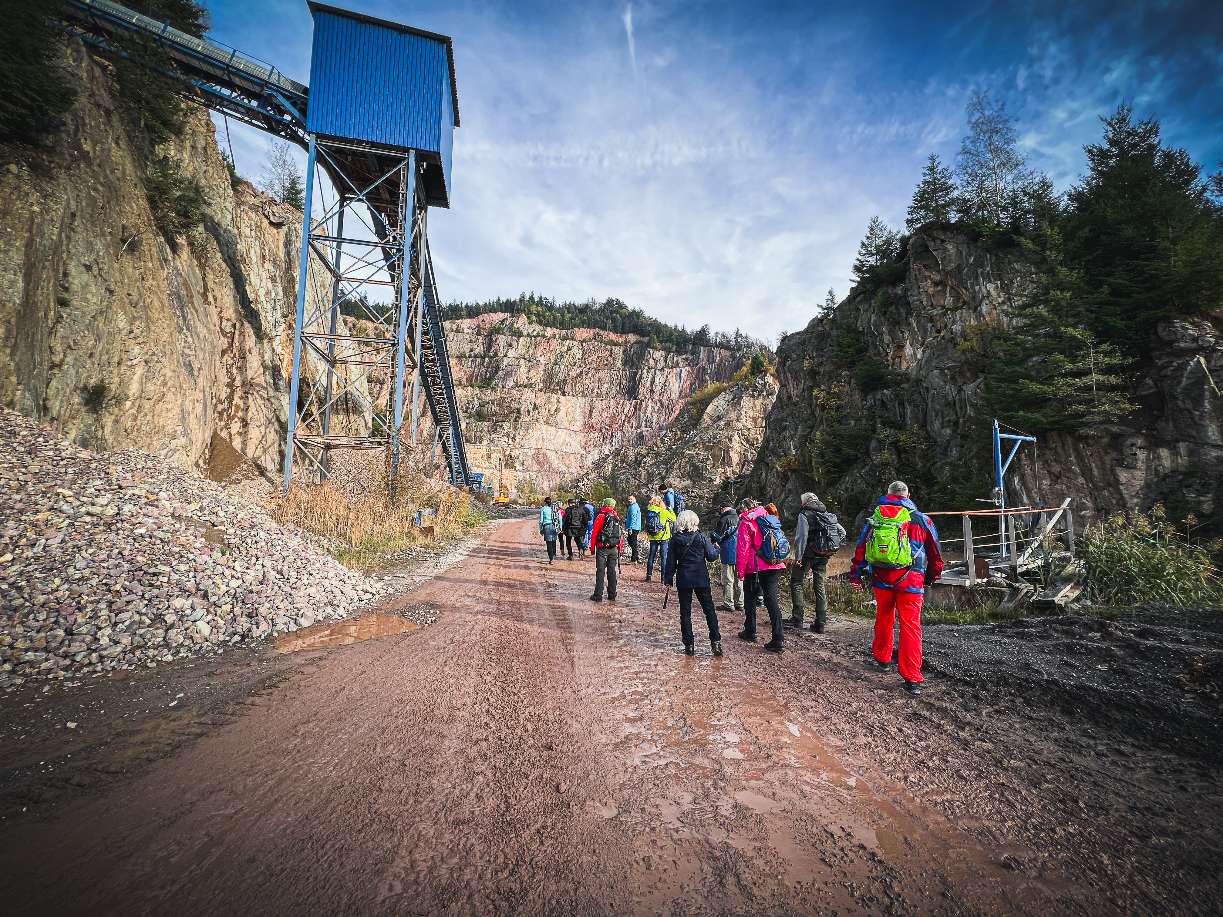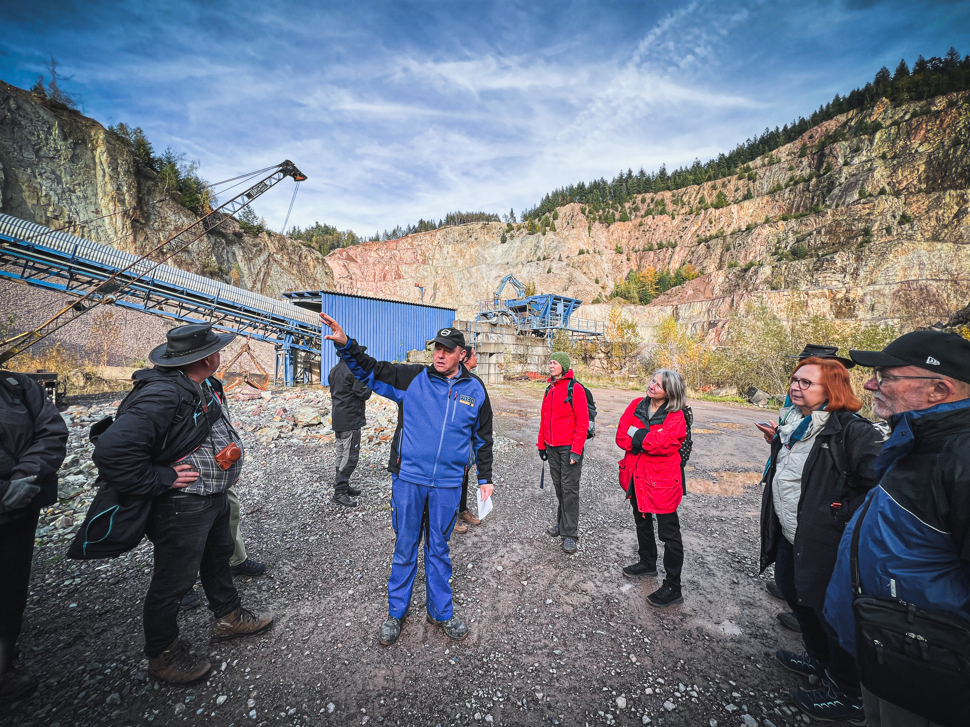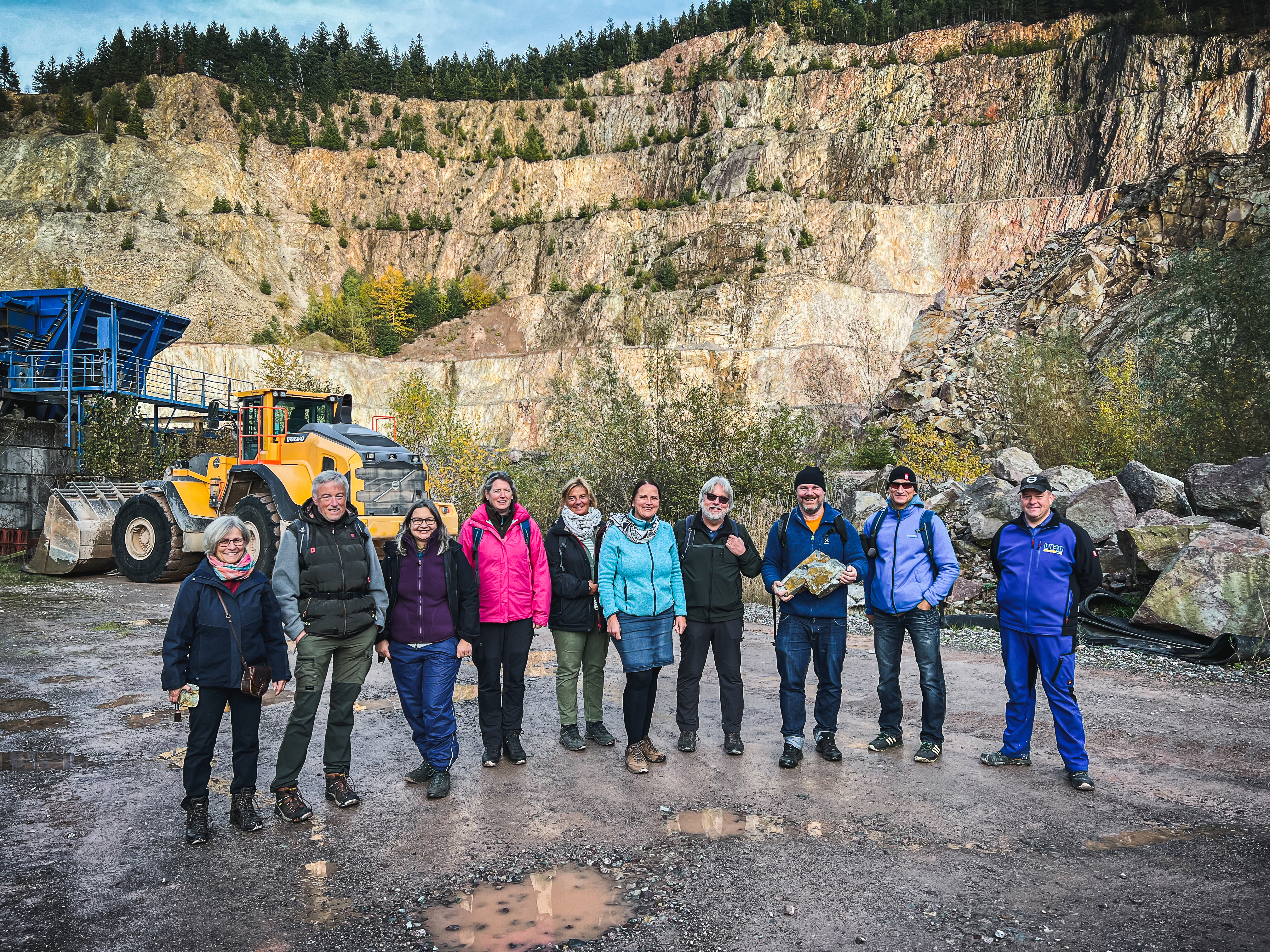 Los ging es am Steinbruch der Firma Wilhelm Bohnert im Gottschlägtal. Werksleiter Jan Steibelt nahm die Gruppe in Empfang und erzählte von der Geschichte des Steinbruchs, die bis in die Mitte des 19. Jahrhunderts zurückreicht. Das Gestein, das ab den 1920er-Jahren großes Interesse und den Geschäftssinn des Firmengründers Wilhelm Bohnert weckte, ist der so genannte Grünberg-Quarzporphyr. Das ist ein besonders hartes Gestein, das bis heute die höchsten Anforderungen für Bahnschotter erfüllt. Bei einer Führung über das Werksgelände erfuhren die Teilnehmer mehr über die Abbaumethoden und die Vorteile regional produzierter mineralischer Schüttgüter.
