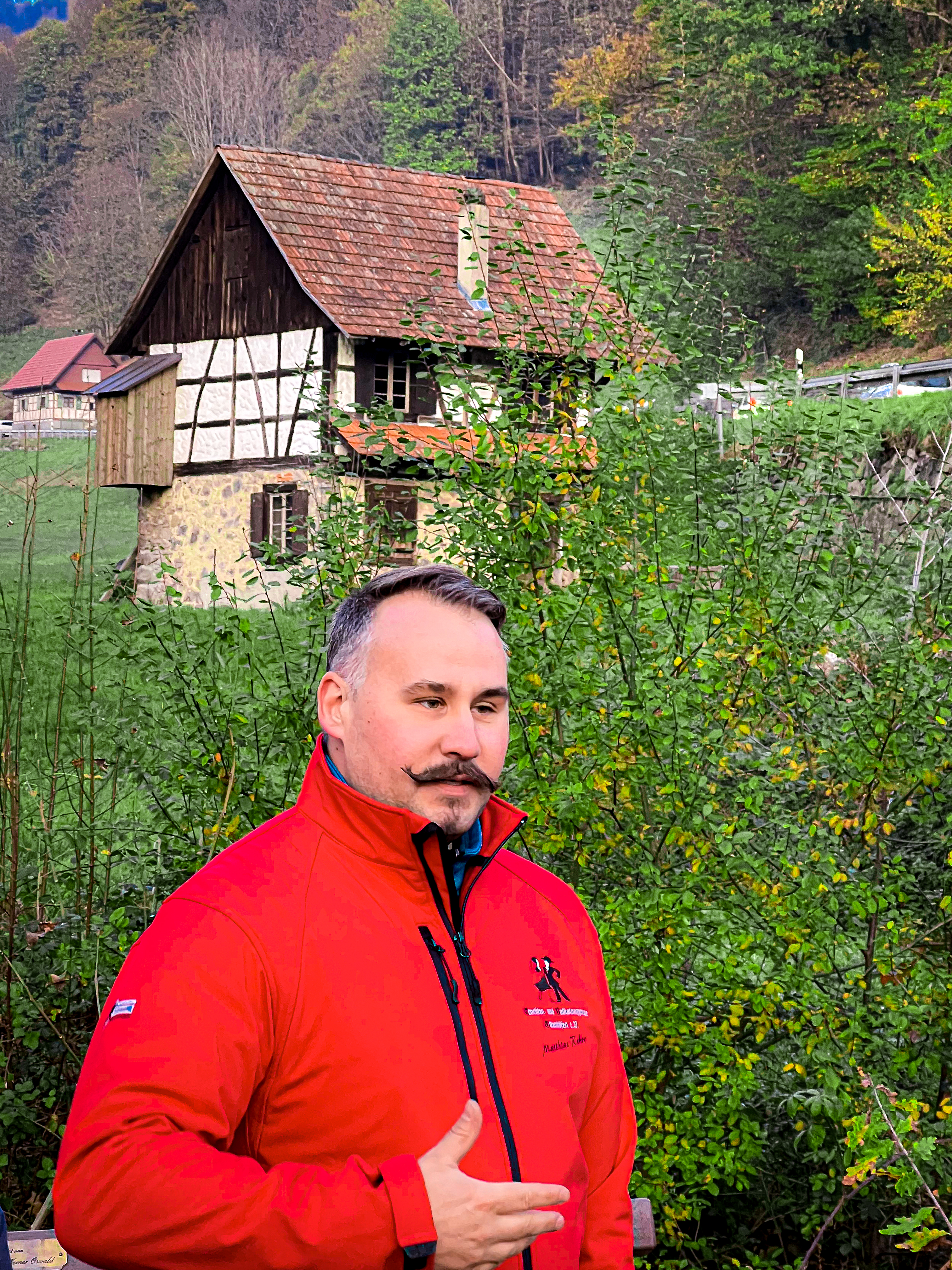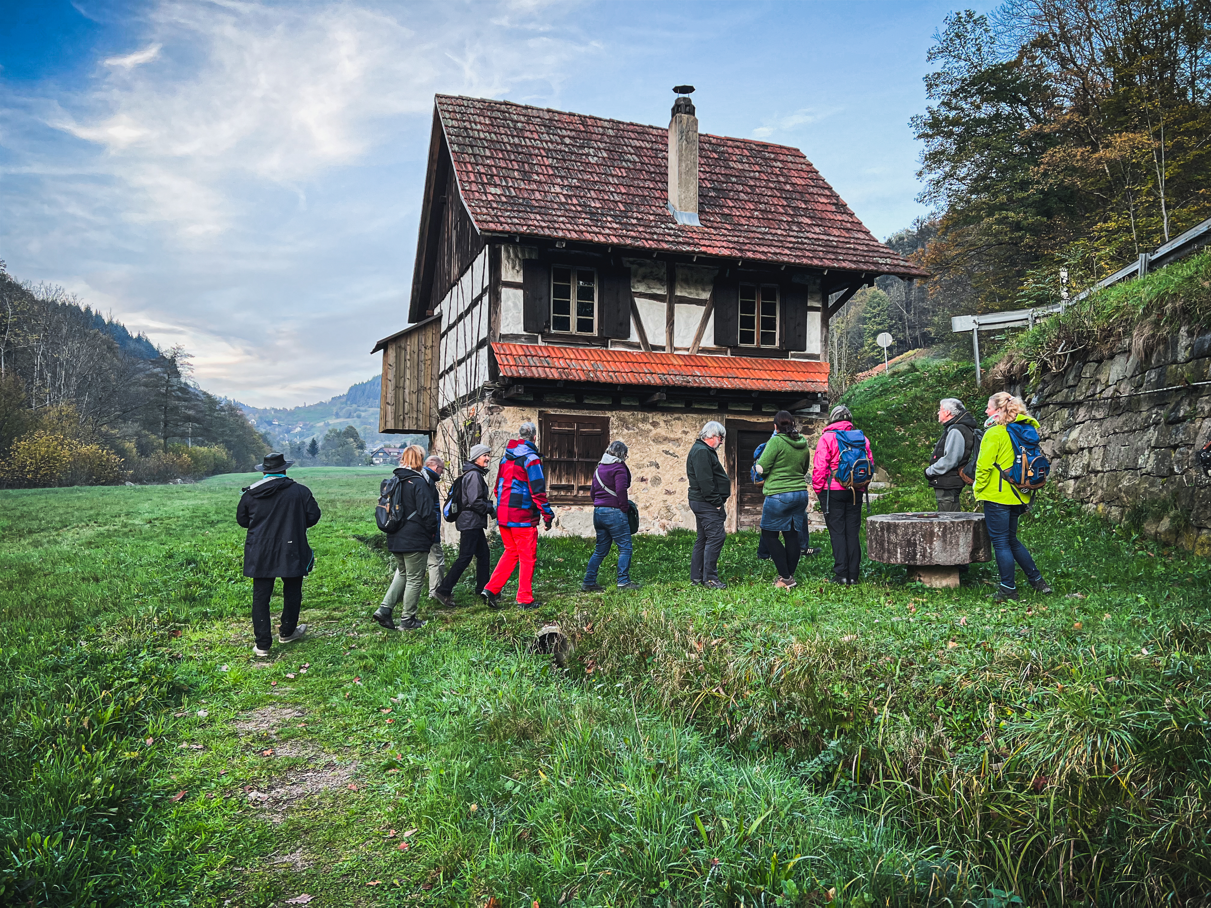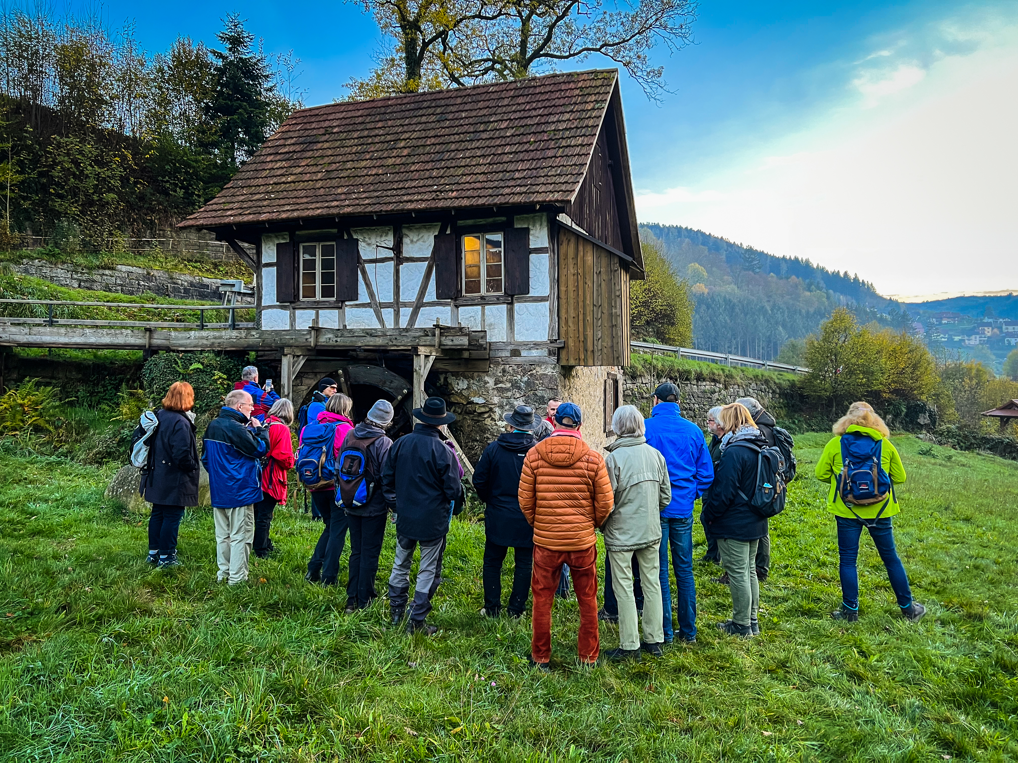 Hier nahm dann auch schon Matthias Rohrer die Gruppe in Empfang. Rohrer stelle sich als einer der Mühlenbauer der Ottenhöfener Trachten- und Volkstanzgruppe vor. Er lud dazu ein, ihn zur Mühle am Hagenstein zu begleiten, die im Volksmund auch „Koppmühle“ genannt wird. Eine kurze Autofahrt und einen nicht weniger kurzen Fußmarsch später standen die Teilnehmer am Ufer der Acher. „Ottenhöfen heißt nicht ohne Grund ‚Mühlendorf’“ meinte Rohrer, denn „hier galt es früher als Zeichen des Wohlstands, sich eine eigene Mühle leisten zu können.“