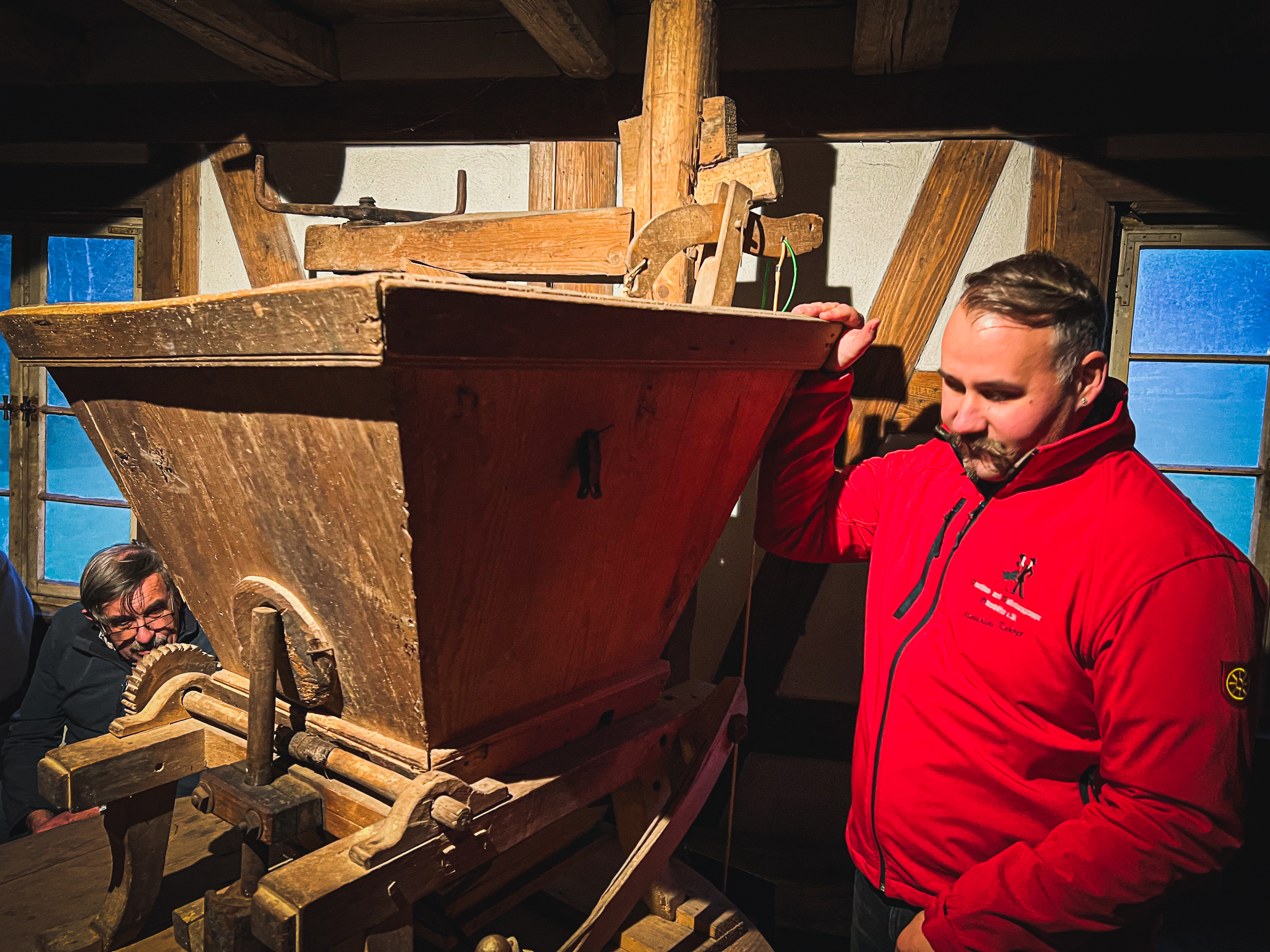 Zur Belohnung durften die Teilnehmer dann auch einen Blick in die Mühle werfen, wo Rohrer die genaue Funktionsweise des Mahlwerks erklärte und alle Fragen dazu beantwortete. Nur ein Raum im oberen Stockwerk der Mühle schien offensichtlich für die Besucher verschlossen zu bleiben und viele fragten sich, was sich hinter dieser Türe wohl verbirgt.