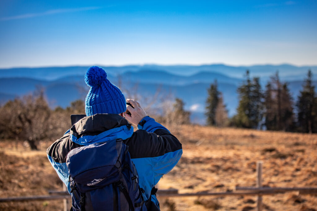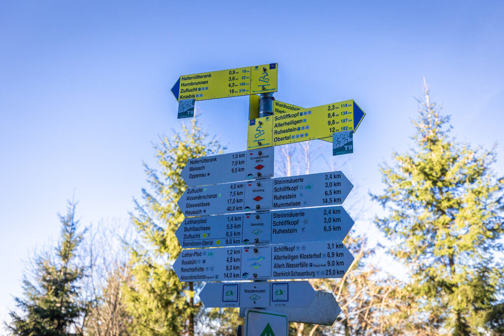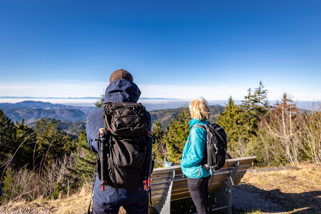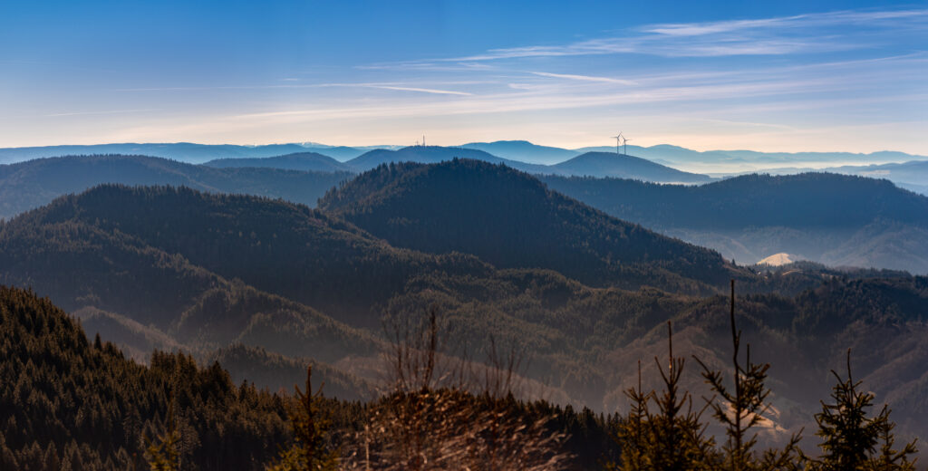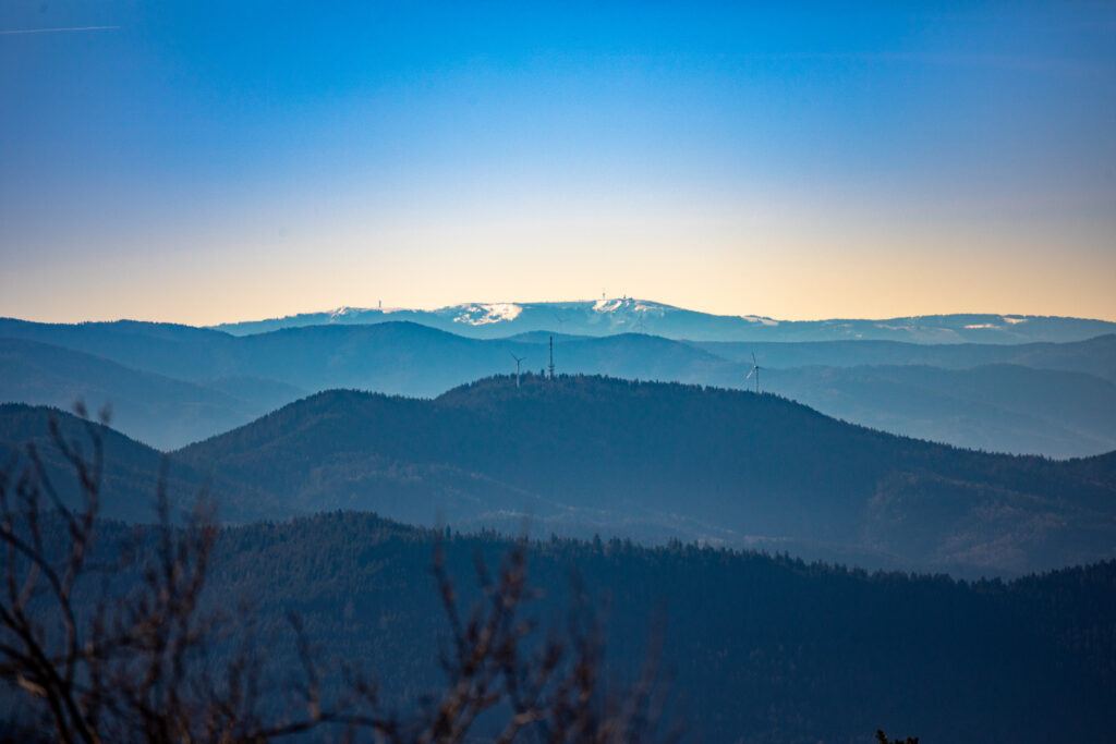 Los ging es an der Alexanderschanze, wo sich alle Teilnehmerinnen und Teilnehmer trafen um von dort aus gemeinsam mit dem ÖPNV zum eigentlichen Startpunkt der Wanderung, dem Schliffkopf zu fahren. Dort angekommen, hieß es erstmal, selbigen zu erklimmen, wozu jedoch lediglich die Überwindung weniger Höhenmeter nötig waren. Am Gipfel angekommen bot sich dann das erste Mal ein sagenhaftes Panorama mit Blick Richtung Rheinebene, Vogesen und Südschwarzwald. Oben auf dem Schliffkopf gibt es glücklicherweise eine Tafel, welche Richtung und Entfernung der zu sehenden Gipfel anzeigt. Dank der mitgebrachten Ferngläser wurden zahlreiche markante Berge, sogar bis hin zu den Alpen, in der Ferne ausgemacht.