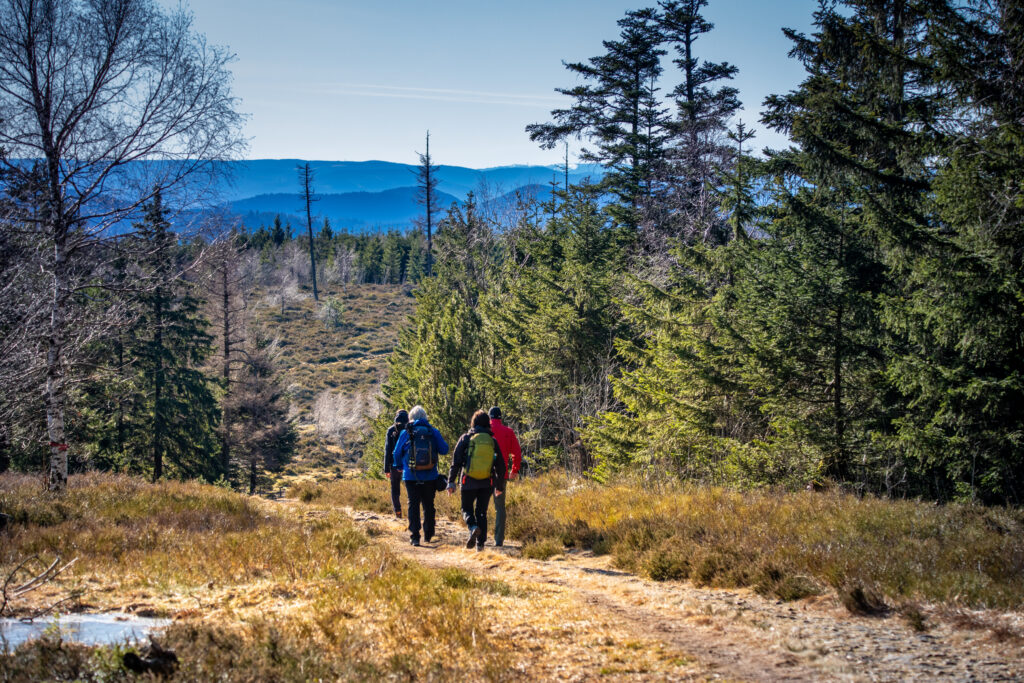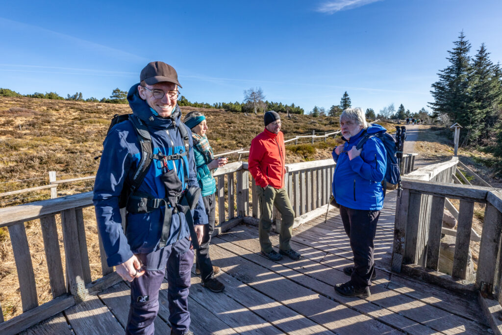 Nach einem kurzen Input zu den Grindeflächen im Nordschwarzwald ging es weiter auf dem Westweg. Grinden (ursprünglich „Kahler Kopf“), werden übrigens die einstmals von Menschen verursachten fast baumfreien Feuchtheiden auf den abgeflachten Buntsandstein-Höhenrücken der Hornisgrinde, Schliffkopf und Kniebis im Nordschwarzwald genannt. Im Laufe der Zeit kam die Beweidung der Grindeflächen zum Erliegen, wurde jedoch in den 90er Jahren als Pilotprojekt wieder aufgenommen. Mittlerweile trägt die Beweidung wieder standardmäßig zur Freihaltung der Grindeflächen bei. In den Sommermonaten sind hier Rinder, Wildpferde und auch Schäfer mit ihren Herden unterwegs. Der weitere Verlauf dieses Teilabschnitts des Westwegs führte die Wandergruppe dann entlang eines Höhenwegs mit Blick auf die Vorbergzone und Rheinebene Richtung Lotharpfad.
