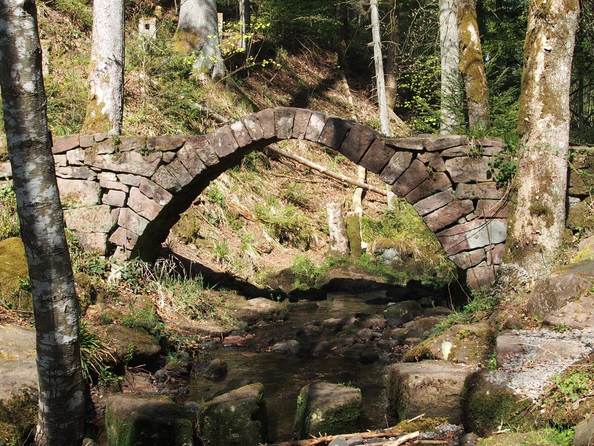 Am Beginn des Waldes treffen wir auf den Kirchweg. Er führt uns immer geradeaus bergab ins romantische Schweinbachtal. Der kurze Abstecher vom Wegeverteiler „Steinernes Brückle“ weiter bergab zum Schweinbach lohnt sich. Dort treffen wir auf eine historische tonnengewölbte Brücke. Sie wurde ohne jegliche Mörtelverbindung im 18. Jahrhundert gebaut. Zumindest erwähnte sie Professor Bohnenberger 1798 in seiner „Charte von Wirttemberg“. Das 2016 renovierte Brücklein dokumentiert Kirchengeschichte im Nordschwarzwald und ist außerdem ein Zeugnis der Technikgeschichte.