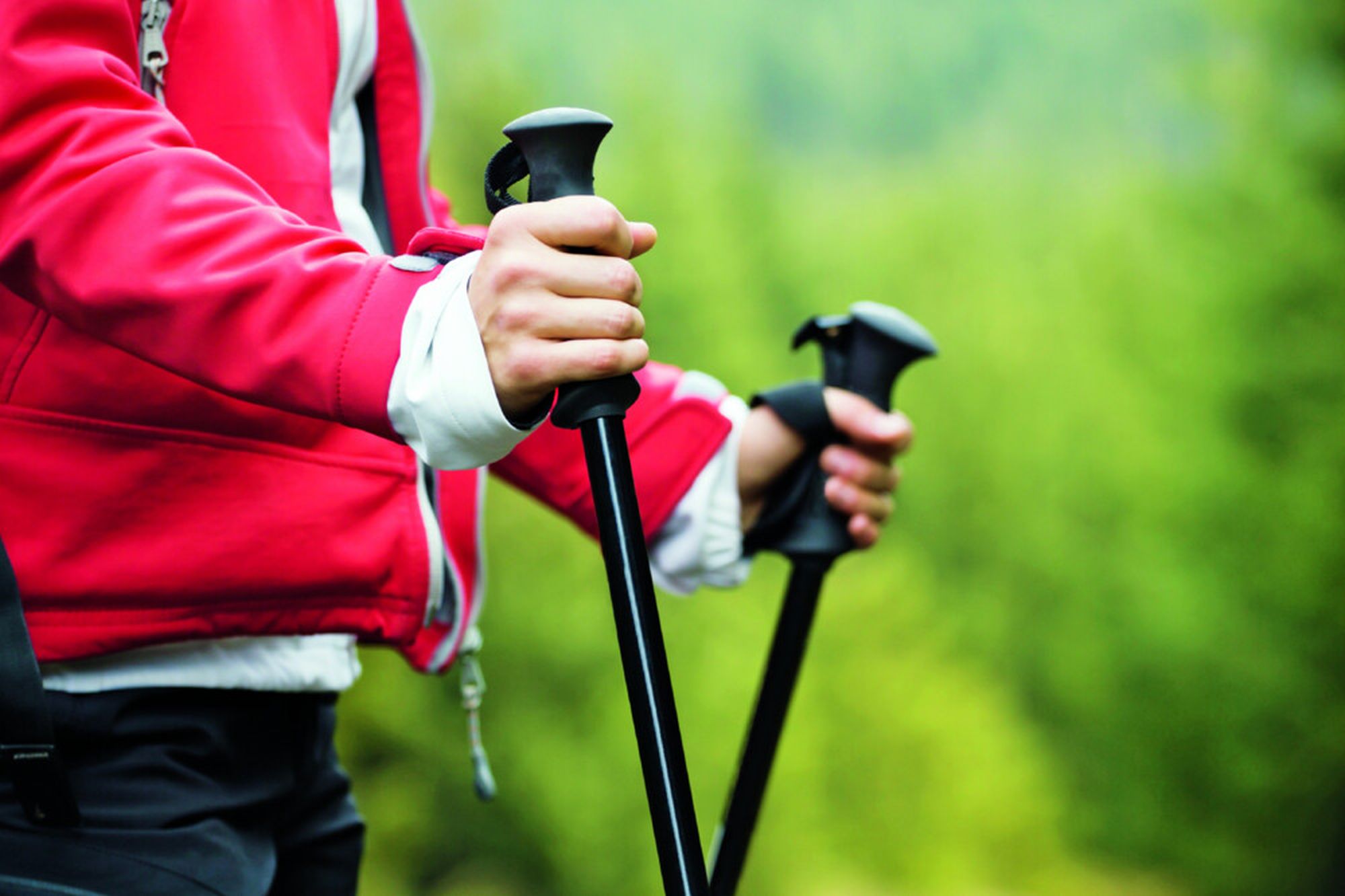 - Ausrüstung: Atmungsaktive, bequeme Kleidung, notfalls wasserabweisend, bequeme, aber stabilisierende Sportschuhe – und natürlich die Stöcke mit Handschlaufen. Die Länge sollte zwei Drittel der Körpergröße betragen. Teleskopstöcke könnt ihr optimal auf euch einstellen.