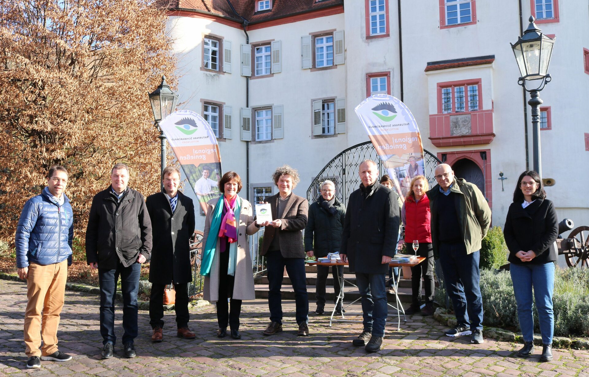 Mitarbeiter und Partner des Weinguts Schloss Neuweier (v.l.): Christian Melcher (Vertrieb & Marketing Weingut Schloss Neuweier), Ulrich Hildner (Ortsvorsteher Neuweier), Dr. Matthias Reinschmidt (Direktor Zoo Karlsruhe), Margret Mergen (Baden-Badener OB und stellvertretende Vorsitzende des Naturparks Schwarzwald Mitte/Nord), Winzer Robert Schätzle, Eugenia Schätzle, Karl-Heinz Dunker (Geschäftsführer Naturpark), Klaus Schätzle (Geschäftsführer Weingut Schloss Neuweier), Christina Cammerer (Fachbereichsleiterin Regionalvermarktung & Regionalentwicklung Naturpark). -