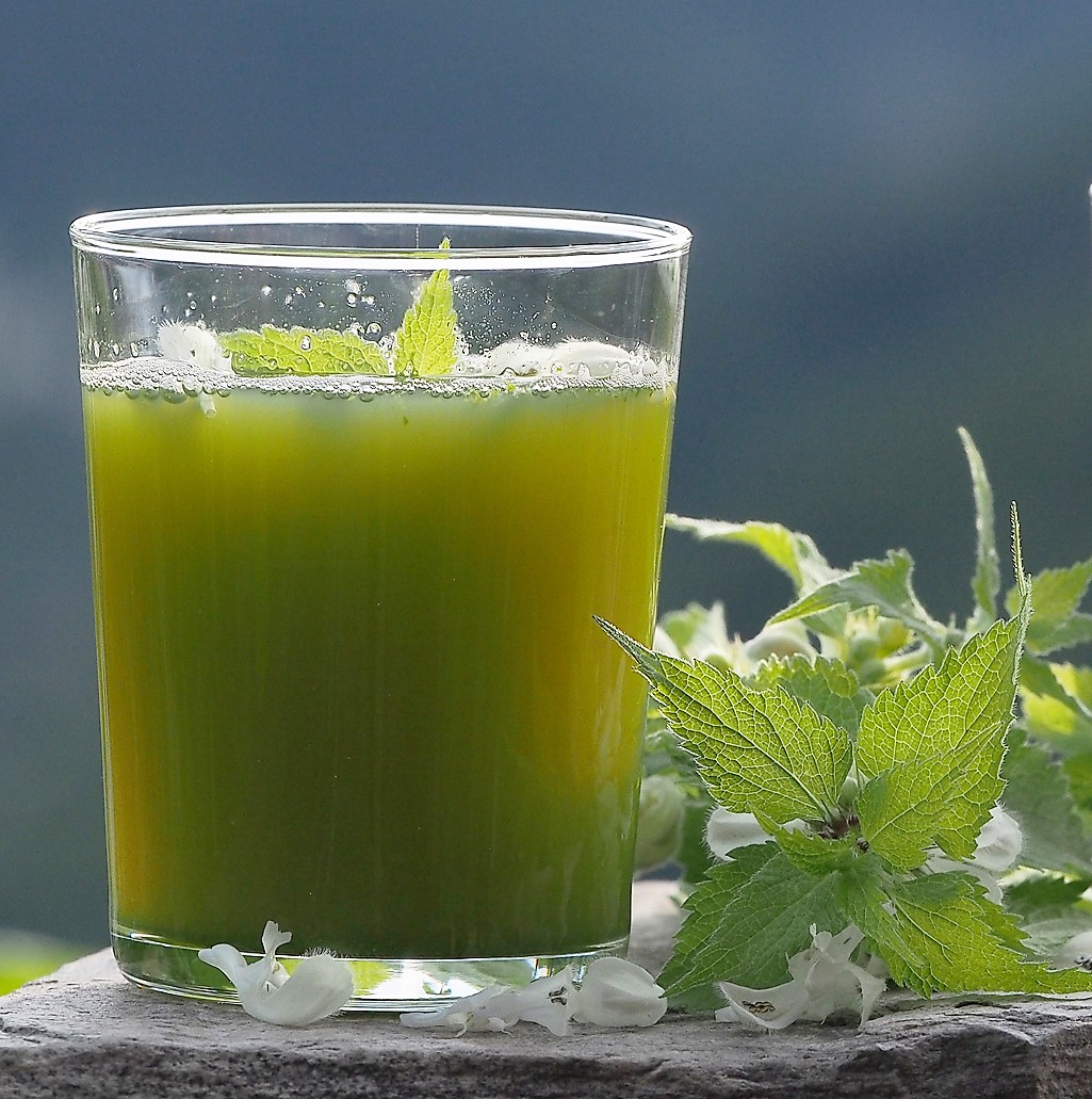 Die Taubnesseln zerkleinert ihr grob, bevor ihr sie mit dem Saft zusammen in einem Mixer fein püriert. Ihr könnt den Trunk als Smoothie dickflüssig trinken oder durch ein Sieb streichen und den aufgefangenen Saft in kleinen Gläschen verteilen und mit Blüten und Blättchen dekoriert servieren.