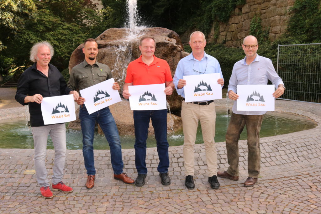 Die Vertreter des Pilotprojekts „Wilde Sau“ mit dem offiziellen Logo (v. l.): Uwe Baumann (Kosmos Schwarzwald), Samuel Golter (Landesjagdverband Baden-Württemberg), Joachim Seeger (Metzgerei Seeger, Kuppenheim), Naturpark-Geschäftsführer Karl-Heinz Dunker, Naturpark-Wirt Thomas Stolz (Restaurant Wolpertinger, Baden-Baden). -
