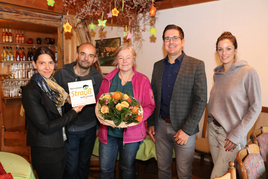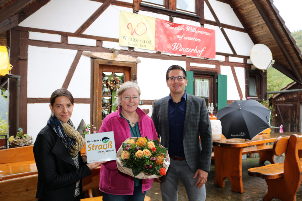 Am 10. Oktober überreichte Yvonne Flesch, stellvertretende Geschäftsführerin des Naturparks Schwarzwald Mitte/Nord im Beisein vom Kappelrodecker Bürgermeister Stefan Hattenbach die Plakette für die Naturpark-Straußwirtschaft an Dagmar und Bernd Doll. Die Plakette am Eingang garantiert Einheimischen und Gästen künftig ein regionales Angebot auf der Speisekarte. Ziel der Auszeichnung ist es, die Erzeuger und Landwirte aus dem Schwarzwald zu stärken und Gäste auf den Zusammenhang zwischen regional produzierten Lebensmitteln und Landschaftspflege hinzuweisen. Der Winzerhof ist bereits die zweite Straußwirtschaft, die in diesem Herbst vom Naturpark ausgezeichnet wurde – und die erste im Ortenaukreis.