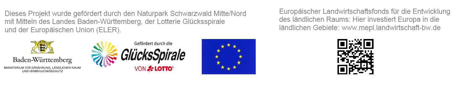 Diese Projekte wurden gefördert durch den Naturpark Schwarzwald Mitte/Nord mit Mitteln des Landes Baden-Württemberg, der Lotterie Glücksspirale und der Europäischen Union (ELER). Europäischer Landwirtschaftsfonds für die Entwicklung des ländlichen Raums: Hier investiert Europa in die ländlichen Gebiete: www.mepl.landwirtschaft-bw.de.